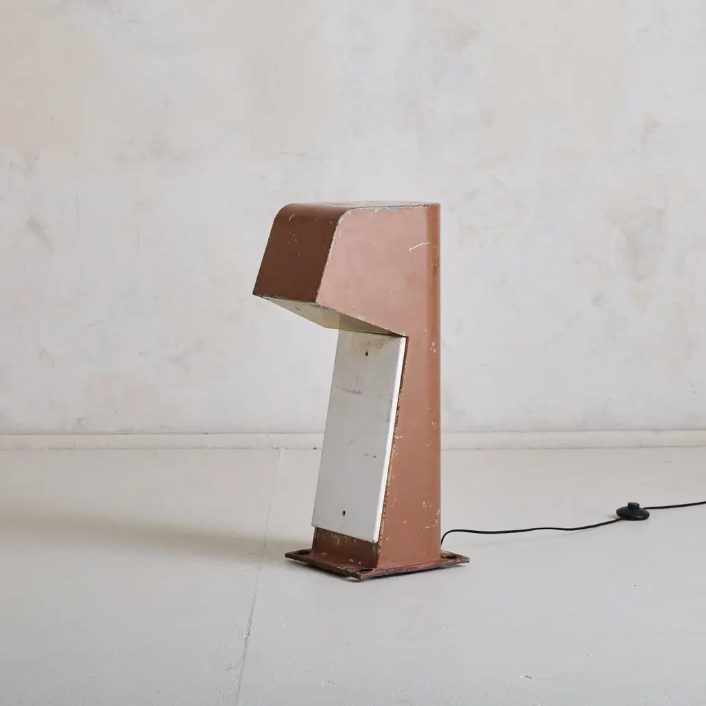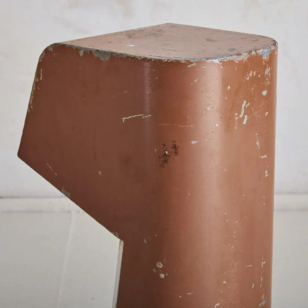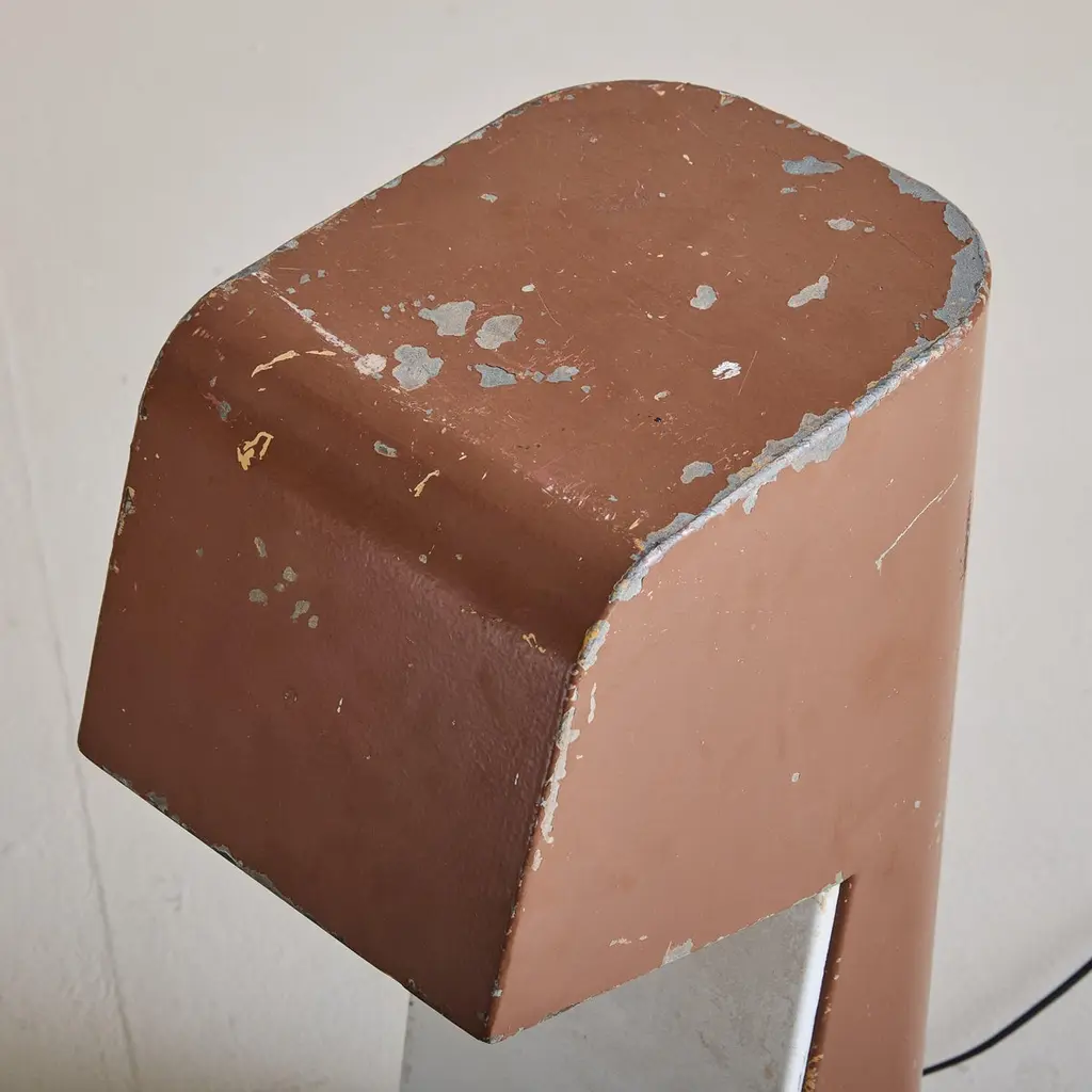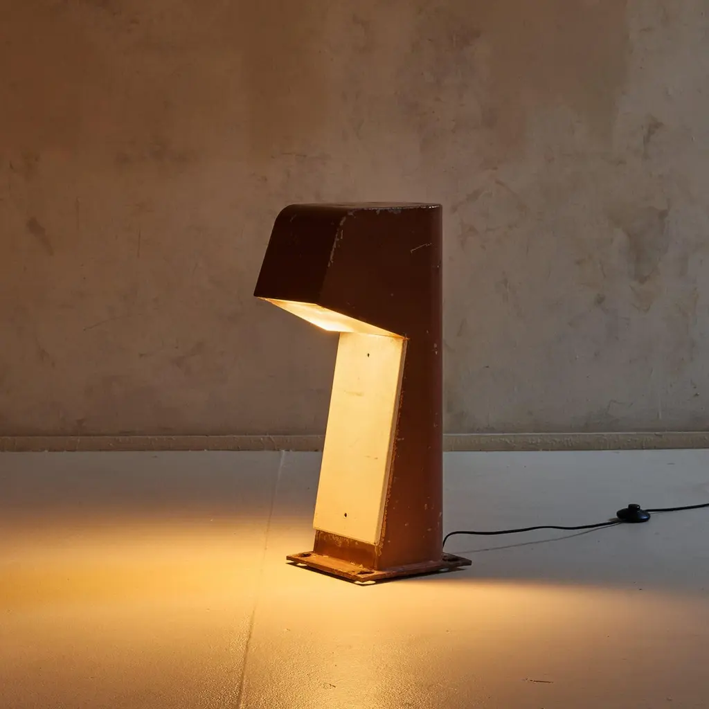 This rare lighting bollard, known as the Blind Bollard (BB), was designed by renowned French architect Jean Balladur in 1969. Crafted from lacquered folded steel, its oblong structure encases a glass diffuser and rests on a square base. The chocolate brown finish has withstood the test of time, adding character and reflecting its rich history.Sold and priced individually.Good vintage condition, with a natural patina and scuffs throughout. This lamp has been professionally rewired for U.S. use by our team of restorationists and includes a foot switch. Accepts one standard base light bulb.