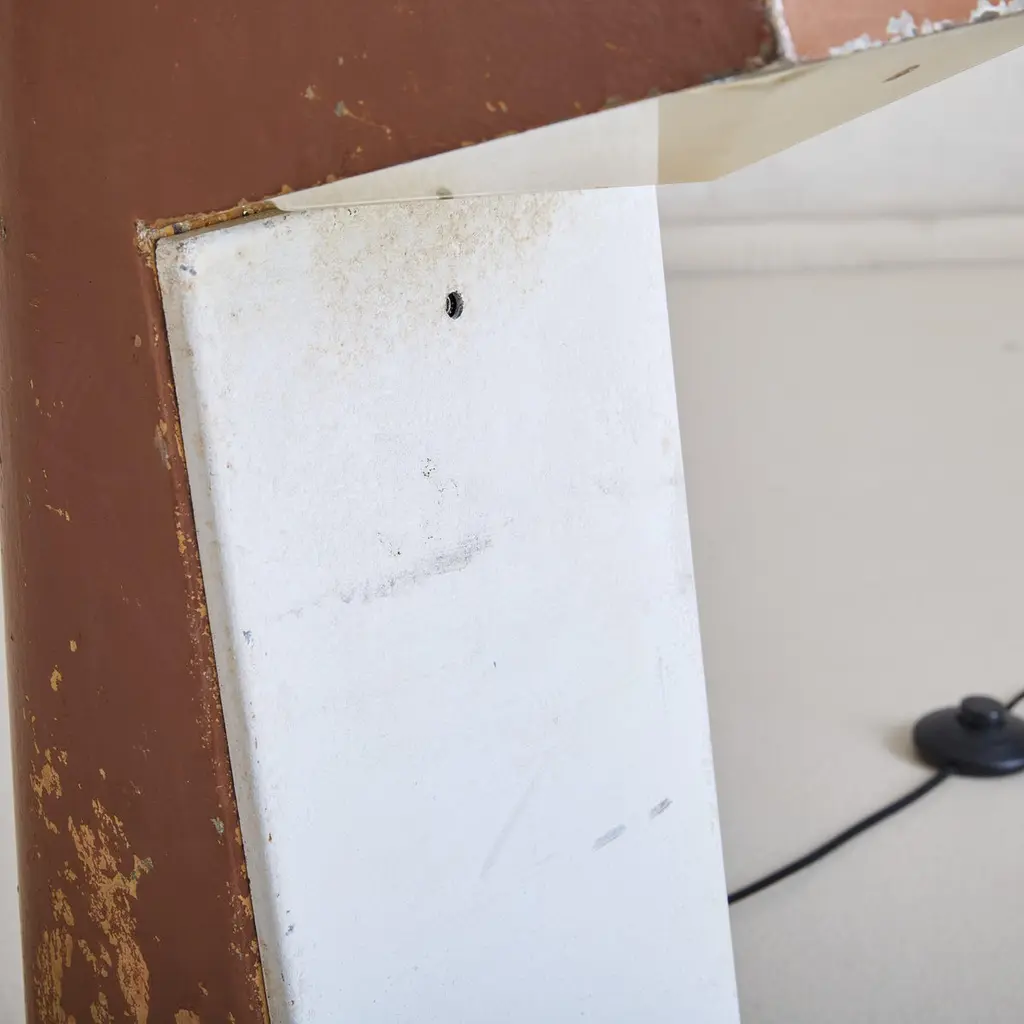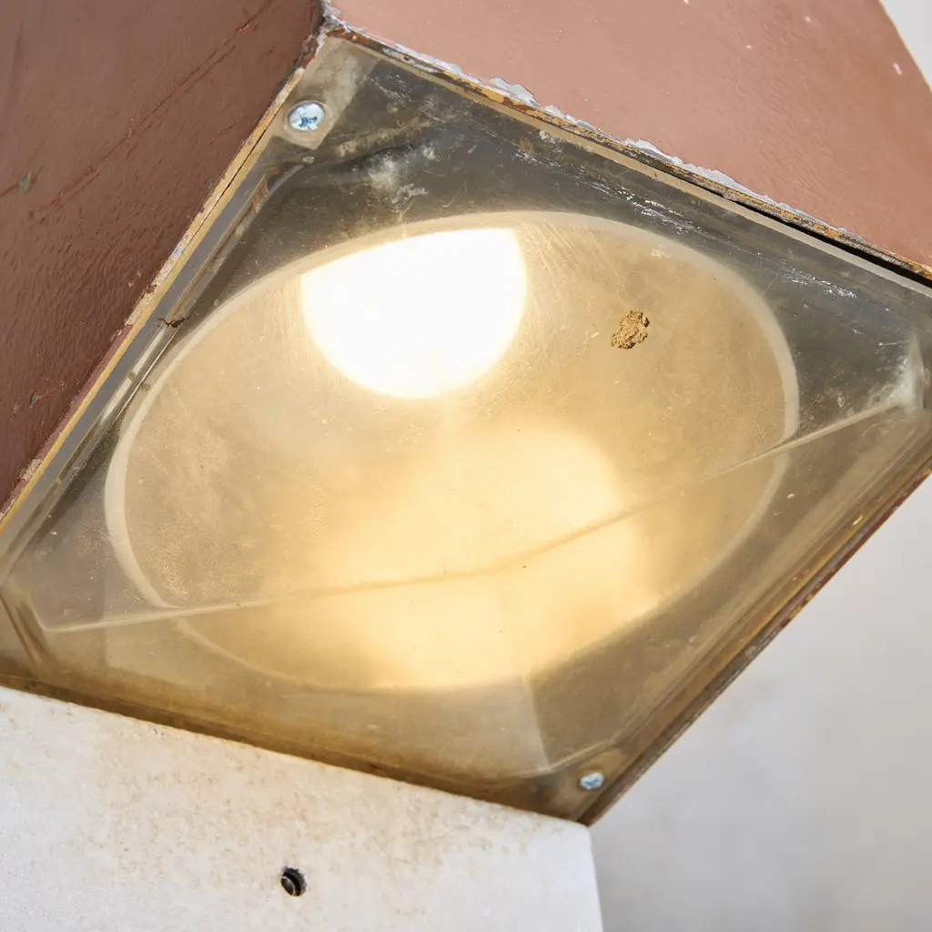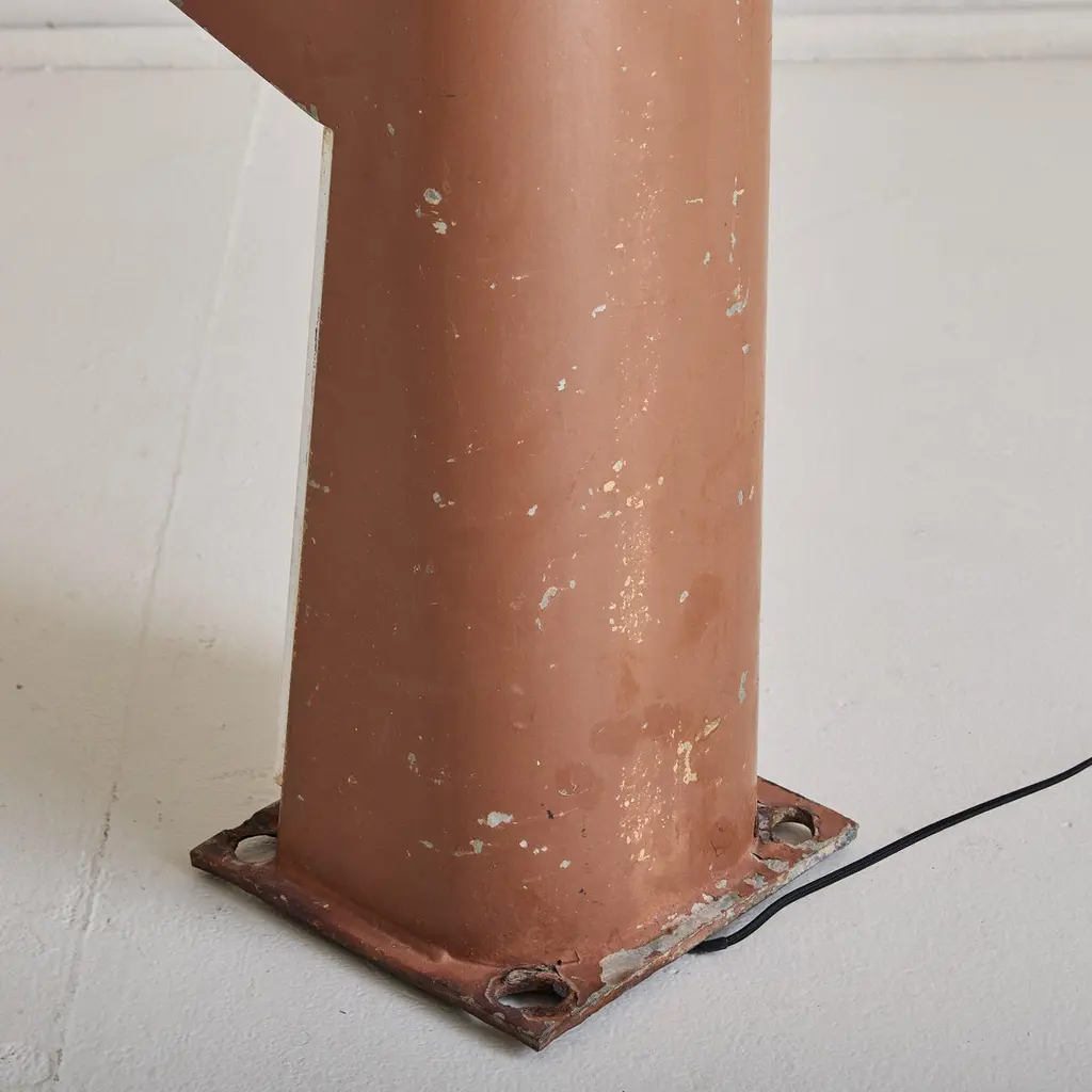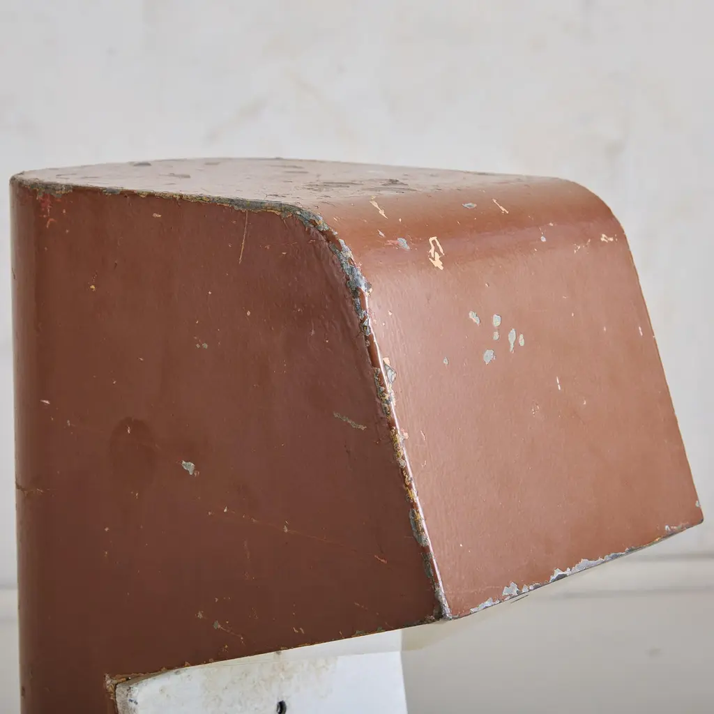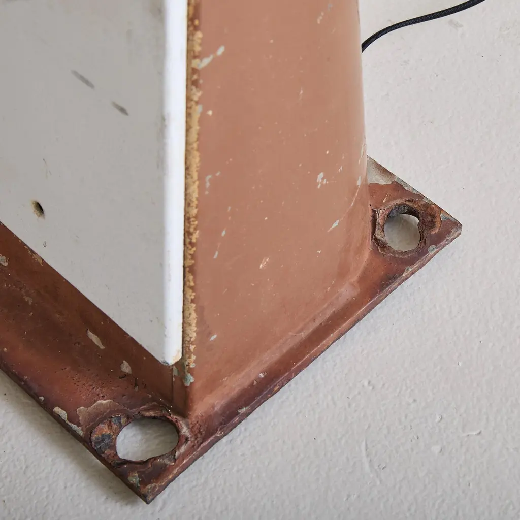 This rare lighting bollard, known as the Blind Bollard (BB), was designed by renowned French architect Jean Balladur in 1969. Crafted from lacquered folded steel, its oblong structure encases a glass diffuser and rests on a square base. The chocolate brown finish has withstood the test of time, adding character and reflecting its rich history.Sold and priced individually.Good vintage condition, with a natural patina and scuffs throughout. This lamp has been professionally rewired for U.S. use by our team of restorationists and includes a foot switch. Accepts one standard base light bulb.