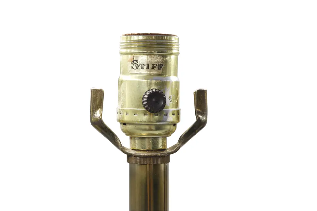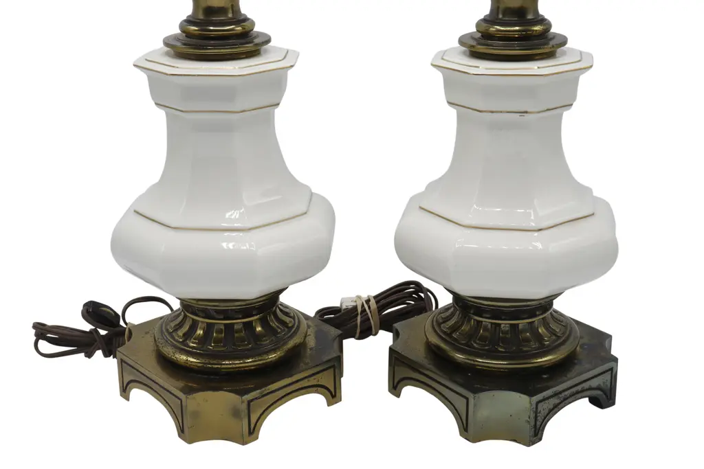 A pair of French Empire style table lamps made by Stiffel. Brass columns are turned with large ceramic fonts in white trimmed in gold. Bases are decorated with dentils on a square base with concave corners. Dimensions per lamp.