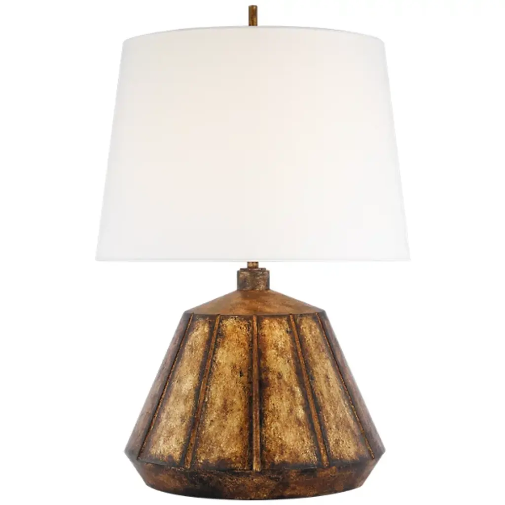 The Frey Table Lamp from Visual Comfort Signature bridges tasteful indoor design and tasteful modern appeal. A Thomas O’Brien creation, its round base bevels outward, heading inward as a conical shape accompanied by a series of angular vertical accents. A slim stem holds powerful lamping, easily mellowed by a flaring fabric shade capped by a cylindrical finial that keeps it in place. The mellow glow extends around the fixture, adding a touch of intrigue and elegance to the body below.
