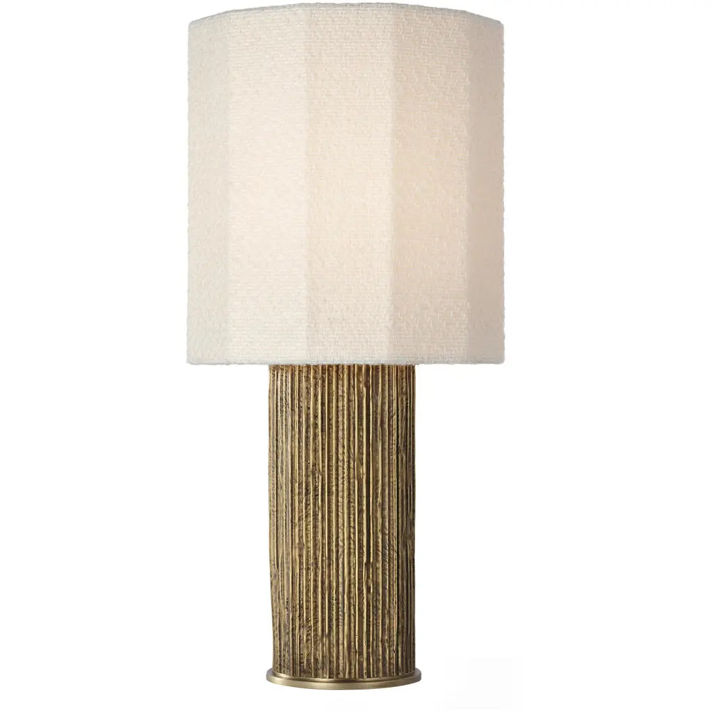 The Frey Table Lamp from Visual Comfort Signature bridges tasteful indoor design and tasteful modern appeal. A Thomas O’Brien creation, its round base bevels outward, heading inward as a conical shape accompanied by a series of angular vertical accents. A slim stem holds powerful lamping, easily mellowed by a flaring fabric shade capped by a cylindrical finial that keeps it in place. The mellow glow extends around the fixture, adding a touch of intrigue and elegance to the body below.