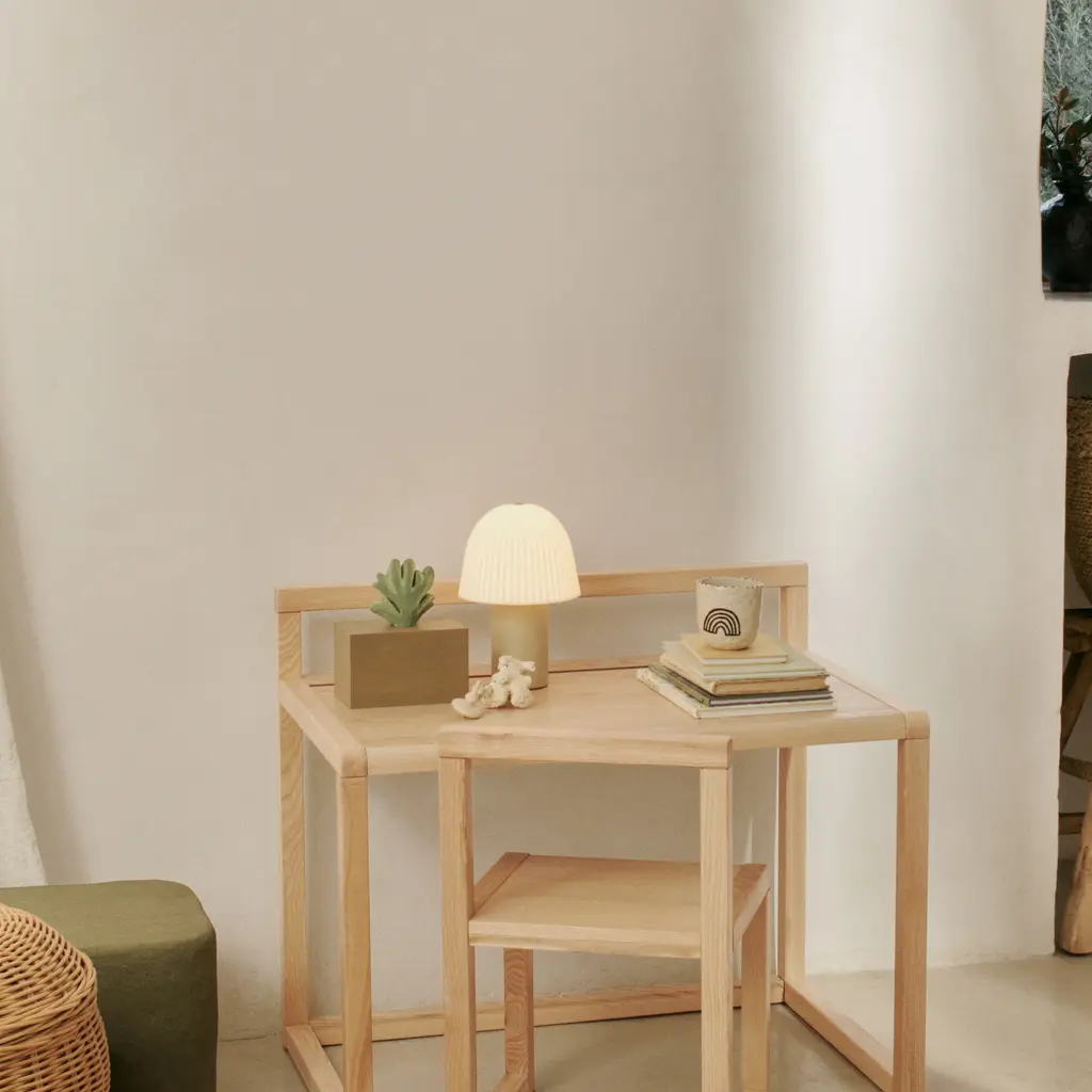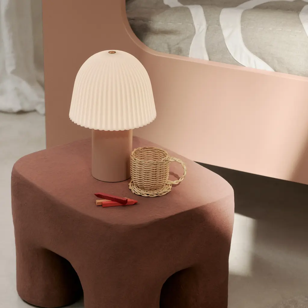 The Frill Portable Lamp from Ferm Living combines practicality with a sophisticated touch, making it the ideal addition to a cozy living space or child's room. Its stable base and fluted shade add depth and texture to the design, creating a warm and cozy atmosphere. Elevate your child's space with this charming and functional lamp. Highlights