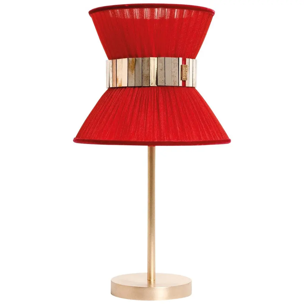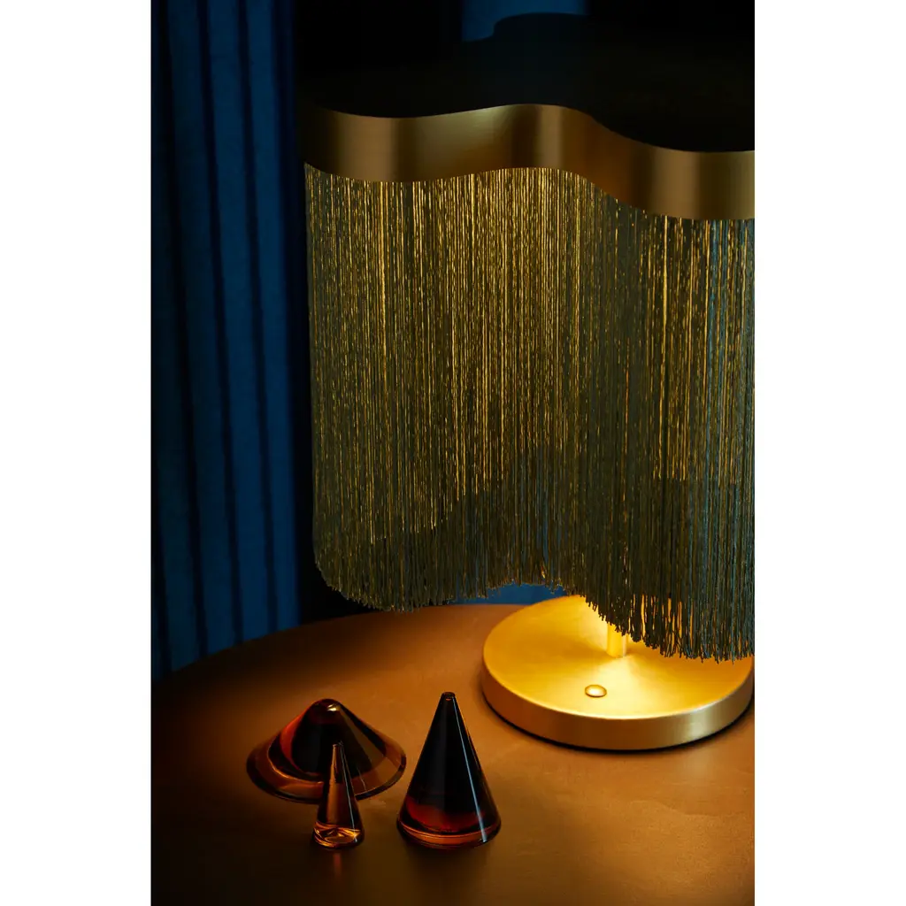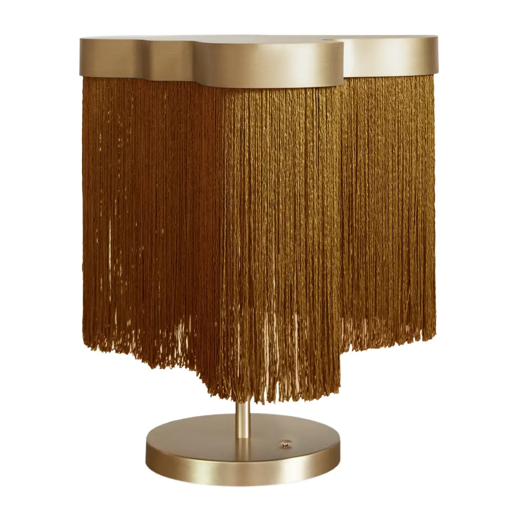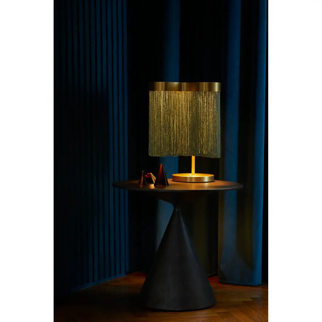 Introduce a touch of luxury with the Fringe LED Table Lamp from Contardi's Arcipelago collection. The premium satin brass body and fire-resistant shade with elegant fringes add sophistication to any room. With an LED customized and dimmable plate controlled by a three-phase dimmer switch, this lamp brings both style and functionality to your space.