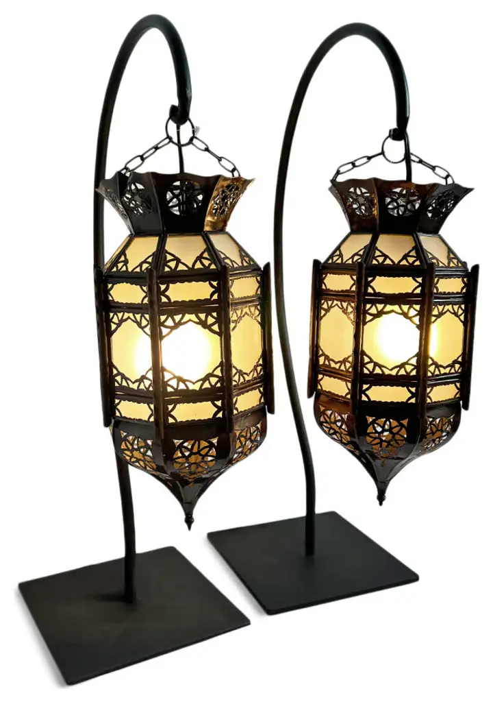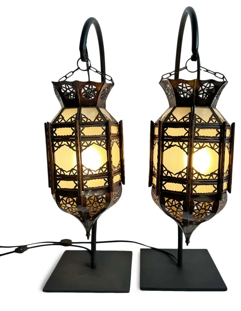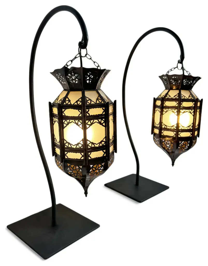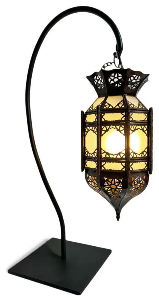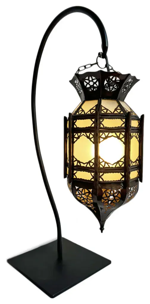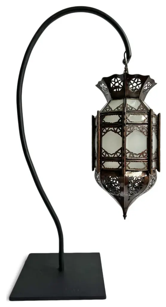 Enchanting Moroccan table lamp with traditional metal work and frosted glass design lantern hung on a black arch iron stand. Each table lamp is sold individually.