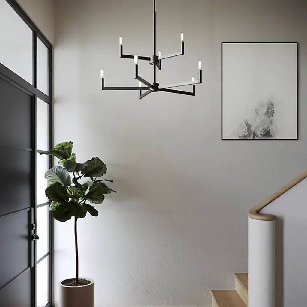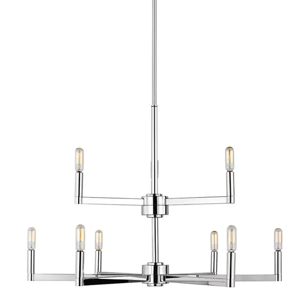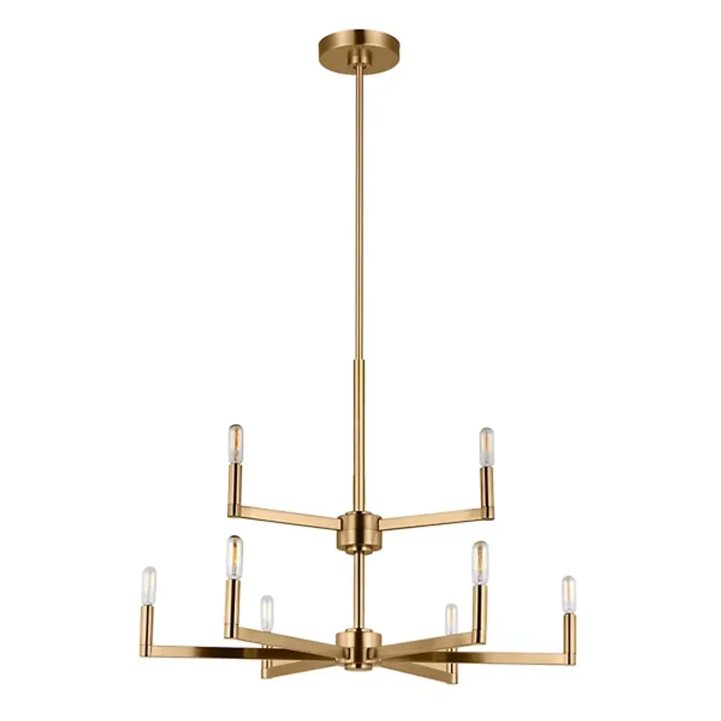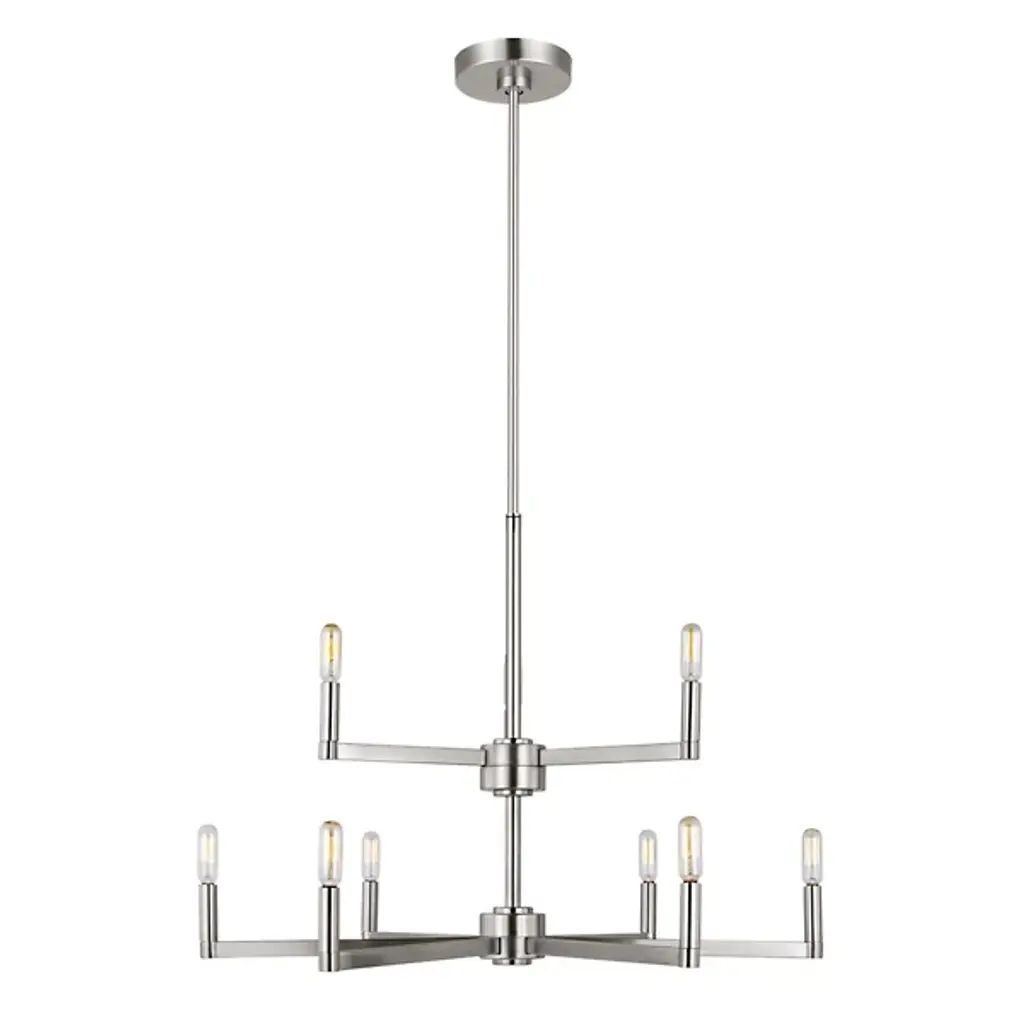 The two-tier Fullton 2-Tier Chandelier from Visual Comfort Studio descends via a circular canopy down a single slender rod, culminating in open candelabra lamping. A subtle fusion of transitional and modern design, it uses small horizontal arms to hold vintage bulbs on the broader lower and slimmer upper tiers. Sloped ceiling adaptable yet still open and expressive and combines simplified form with crafted quality. Let its graceful silhouette modernize with an understated glow.