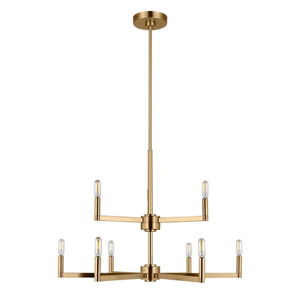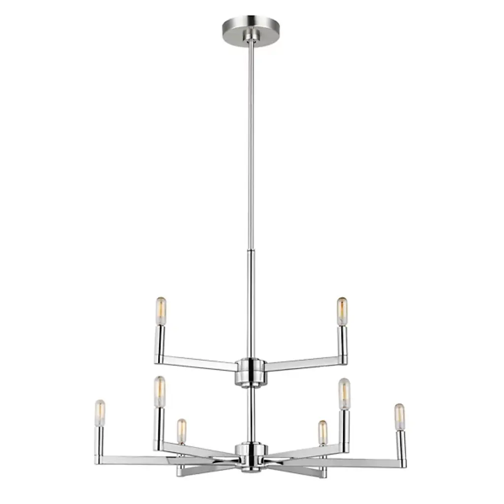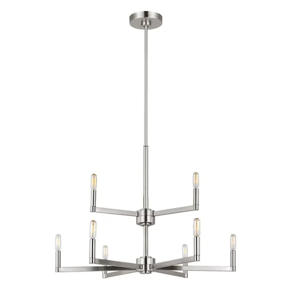 The two-tier Fullton 2-Tier Chandelier from Visual Comfort Studio descends via a circular canopy down a single slender rod, culminating in open candelabra lamping. A subtle fusion of transitional and modern design, it uses small horizontal arms to hold vintage bulbs on the broader lower and slimmer upper tiers. Sloped ceiling adaptable yet still open and expressive and combines simplified form with crafted quality. Let its graceful silhouette modernize with an understated glow.