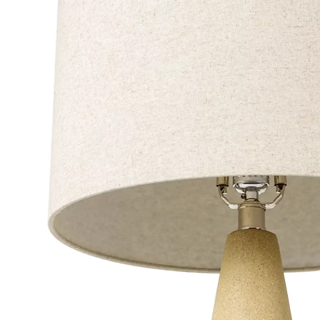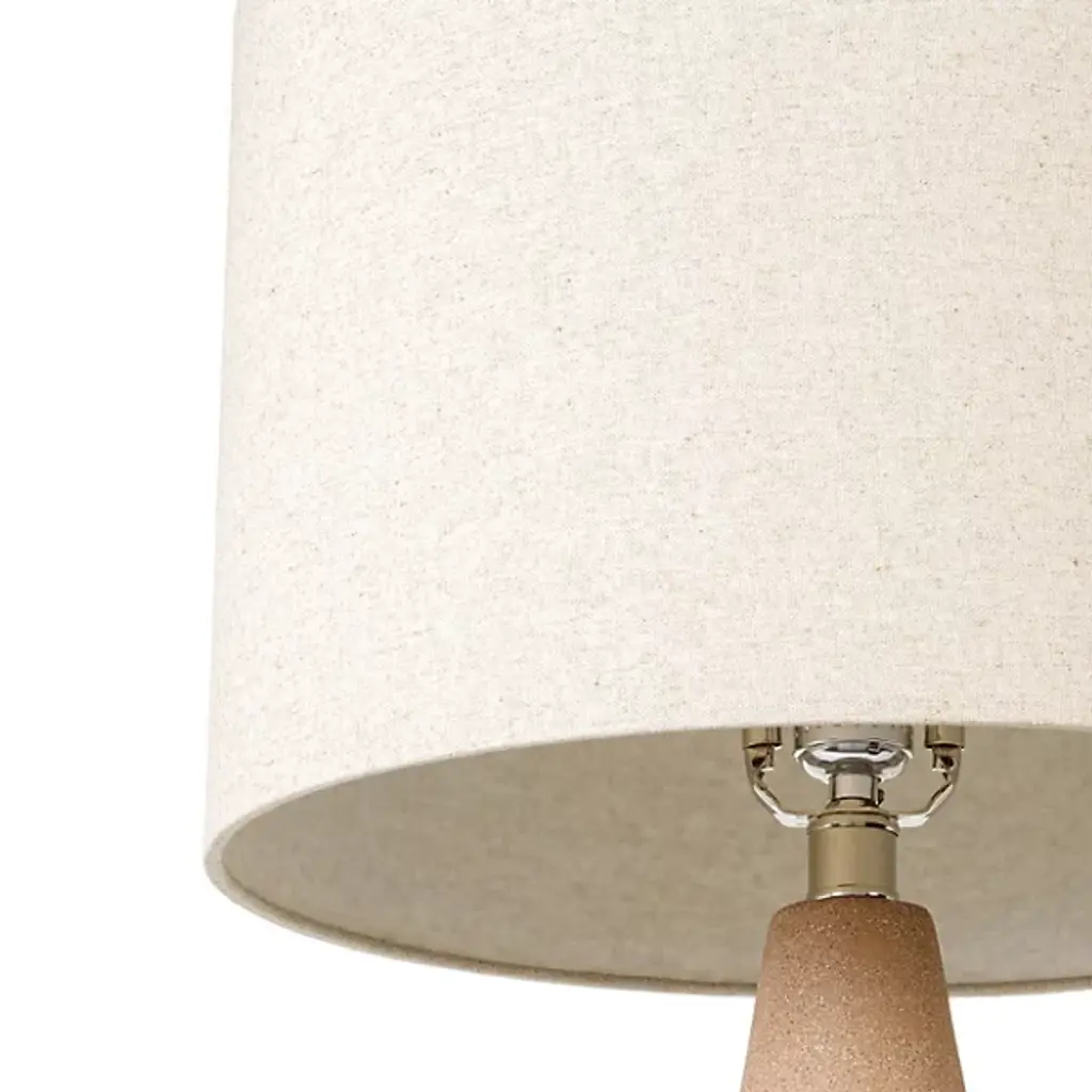 The Fulton Table Lamp from Surya features a tapered concrete base that creates a strong geometric foundation. Its drum-shaped linen shade disperses light upward, washing walls and ceilings with a soft glow. The lamp’s simple socket switch allows easy operation, while the iron finial adds a thoughtful finishing touch. Its minimalist outline makes it suitable for bedside tables or living room surfaces, allowing the textural quality of the concrete to become a subtle accent. The contrasting smoothness of the shade against the slightly rough concrete creates a pleasing balance that is ideal for modern interiors.