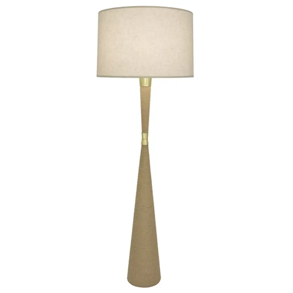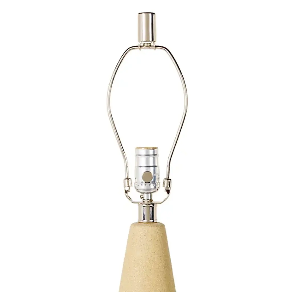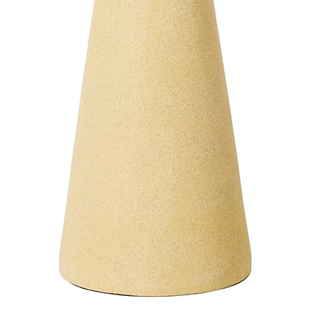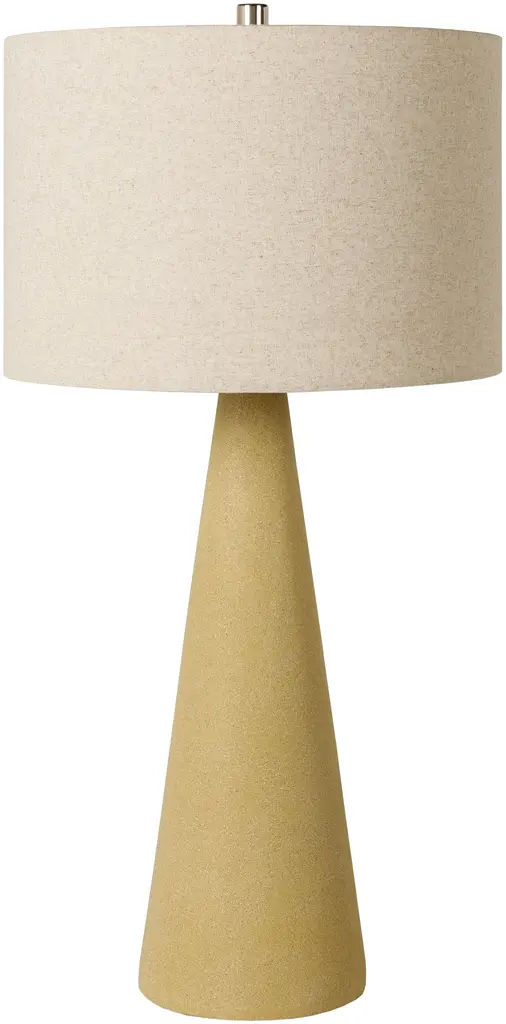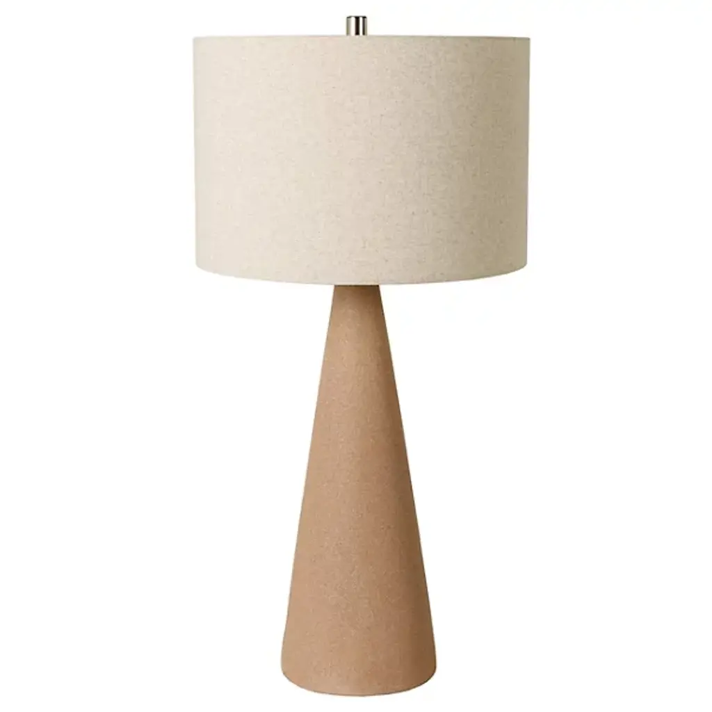 The Fulton Table Lamp from Surya features a tapered concrete base that creates a strong geometric foundation. Its drum-shaped linen shade disperses light upward, washing walls and ceilings with a soft glow. The lamp’s simple socket switch allows easy operation, while the iron finial adds a thoughtful finishing touch. Its minimalist outline makes it suitable for bedside tables or living room surfaces, allowing the textural quality of the concrete to become a subtle accent. The contrasting smoothness of the shade against the slightly rough concrete creates a pleasing balance that is ideal for modern interiors.
