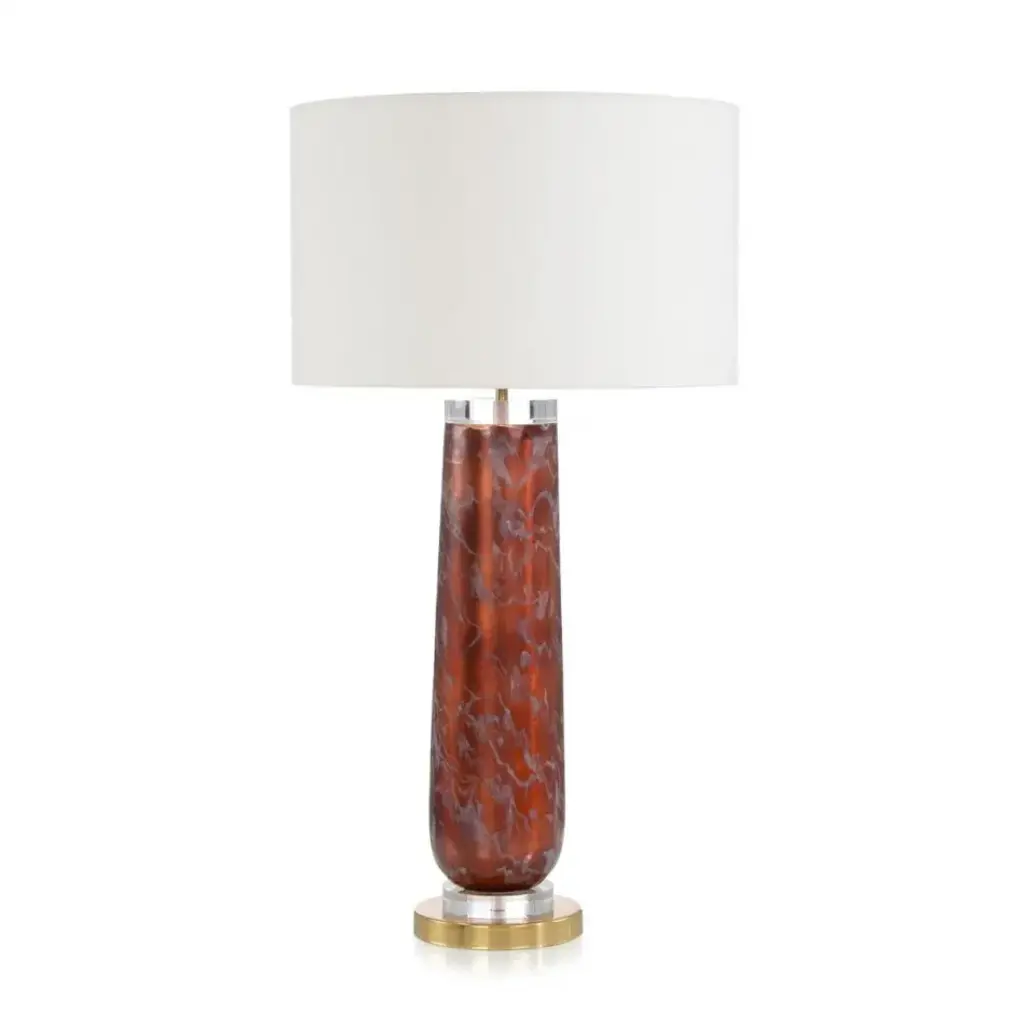 The Fumar Table Lamp features a cylindrical aluminum body with a gorgeous taper near the bottom. With a lustrous enamel finish, the body takes on a gorgeous sienna sheen with subtle grey flourishes that beautifully complements the rounded base and neck accent in polished brass. Above the brass base, a rounded cut of clear acrylic imbues the piece with a pristine modern flair, and is matched by an acrylic accent at the neck. The finial, also with a brass finish, displays a lovely curvature that completes the look of this innovative turnkey lamp.