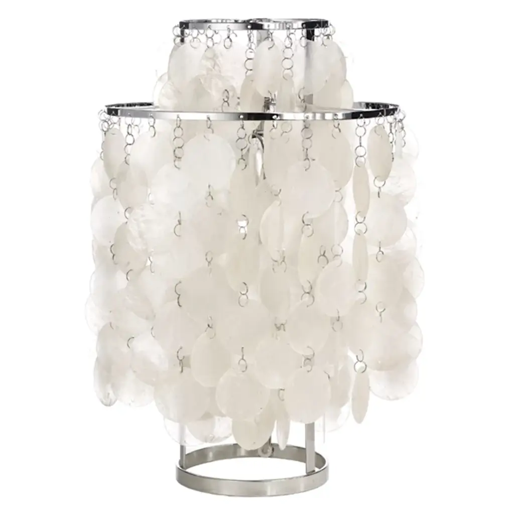 The Fun 2TM Table Lamp from Verpan gives your living space a glamorous aesthetic. It is designed by Verner Panton. Your table features a framework of metal that has been elegantly worked into the shapes of rings, giving Fun a tiered presentation. Cascading from top to bottom are gorgeous seashell discs that form the shade material, adding sophistication and nicely tempering the light emitting from an LED. Place this table lamp in various settings to give your décor a contemporary look.