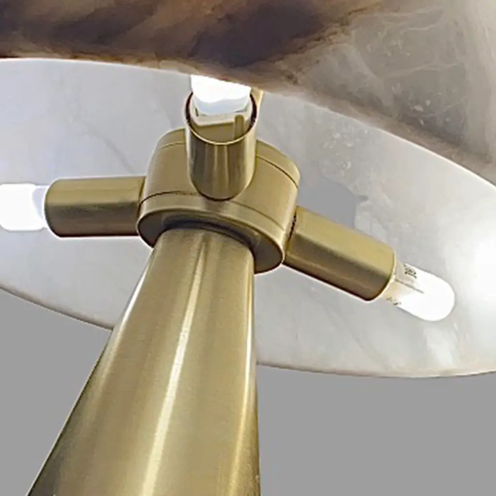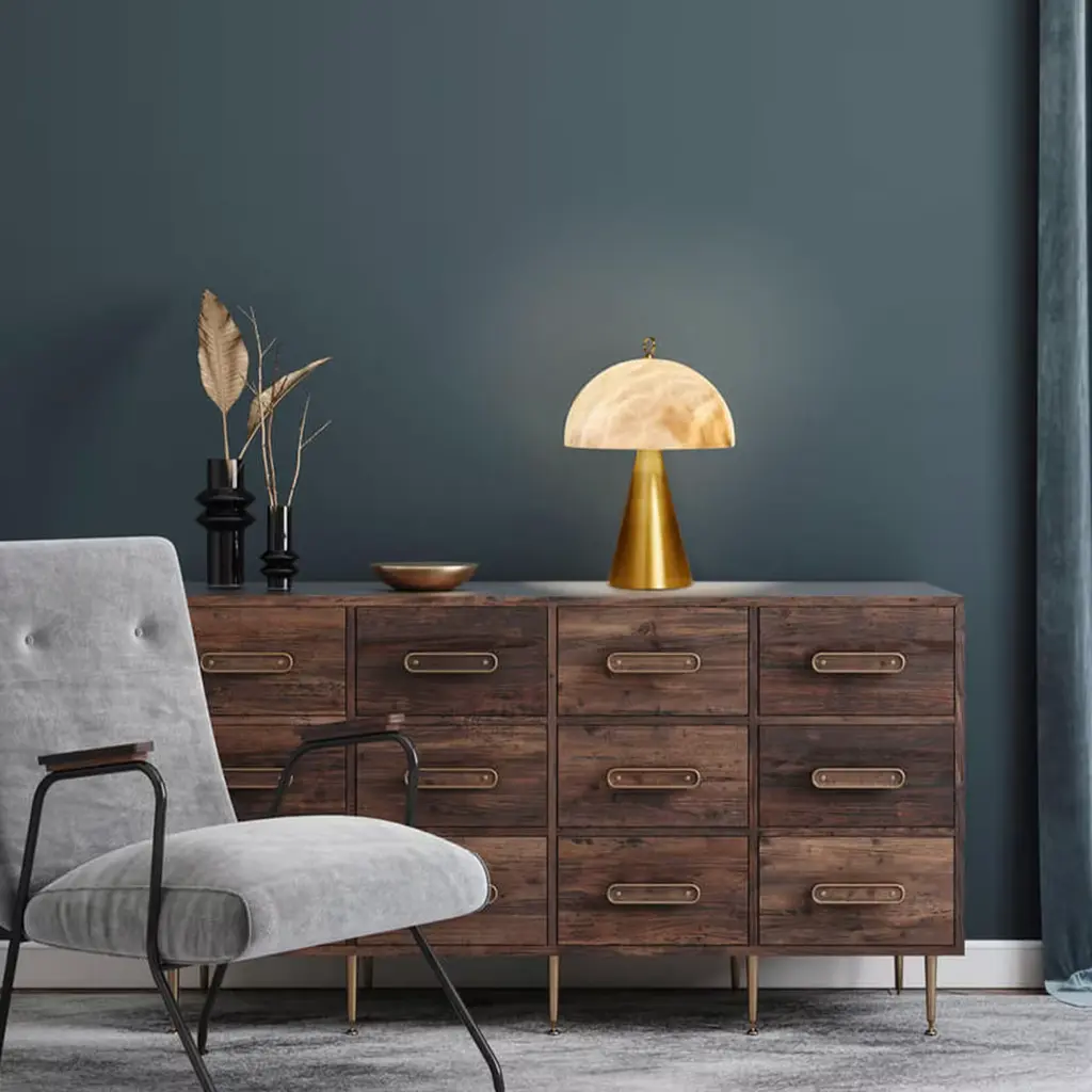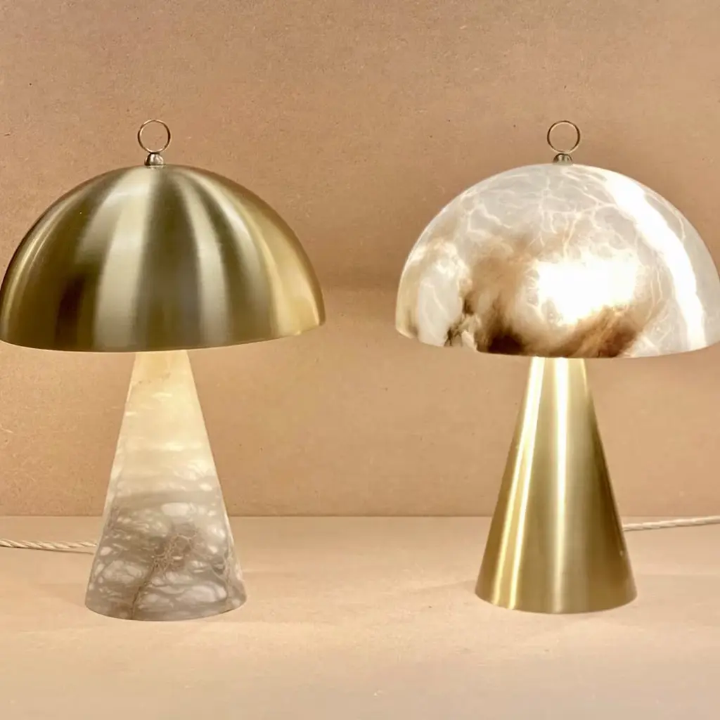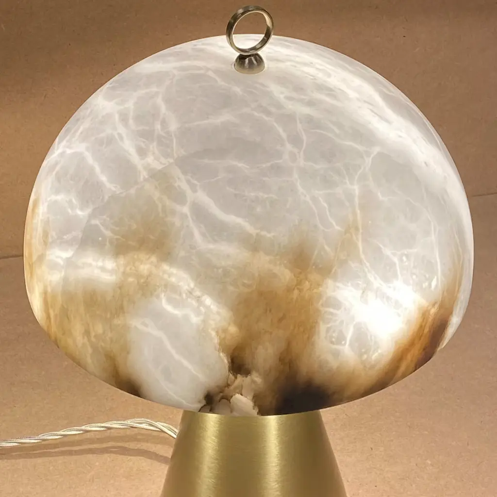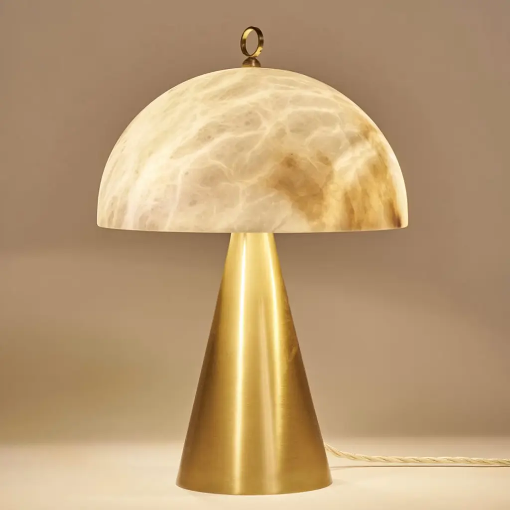 A compact table lamp: a small jewel where the veins are the protagonist on the semi-spherical lampshade or the conical alabaster base. This lamp is offered in two versions, alternating alabaster and satin brass for the lampshade and base.