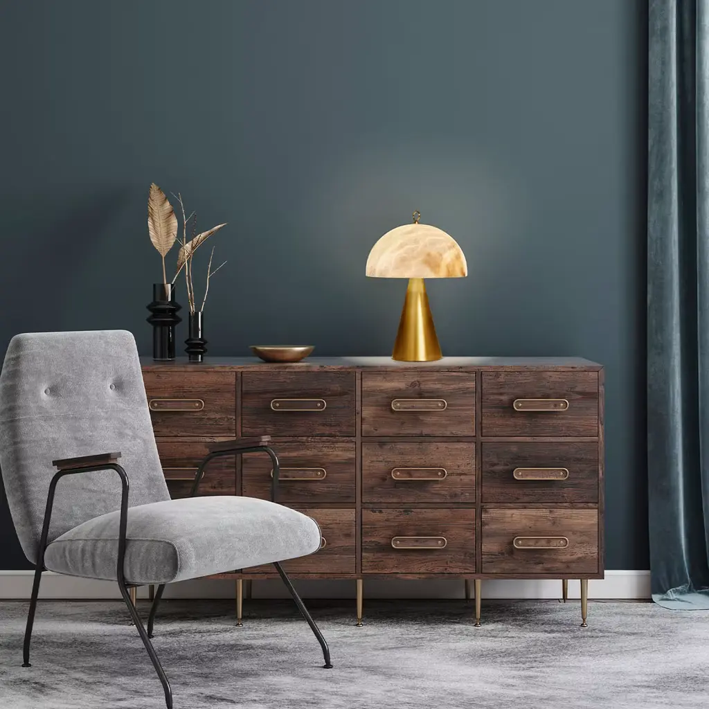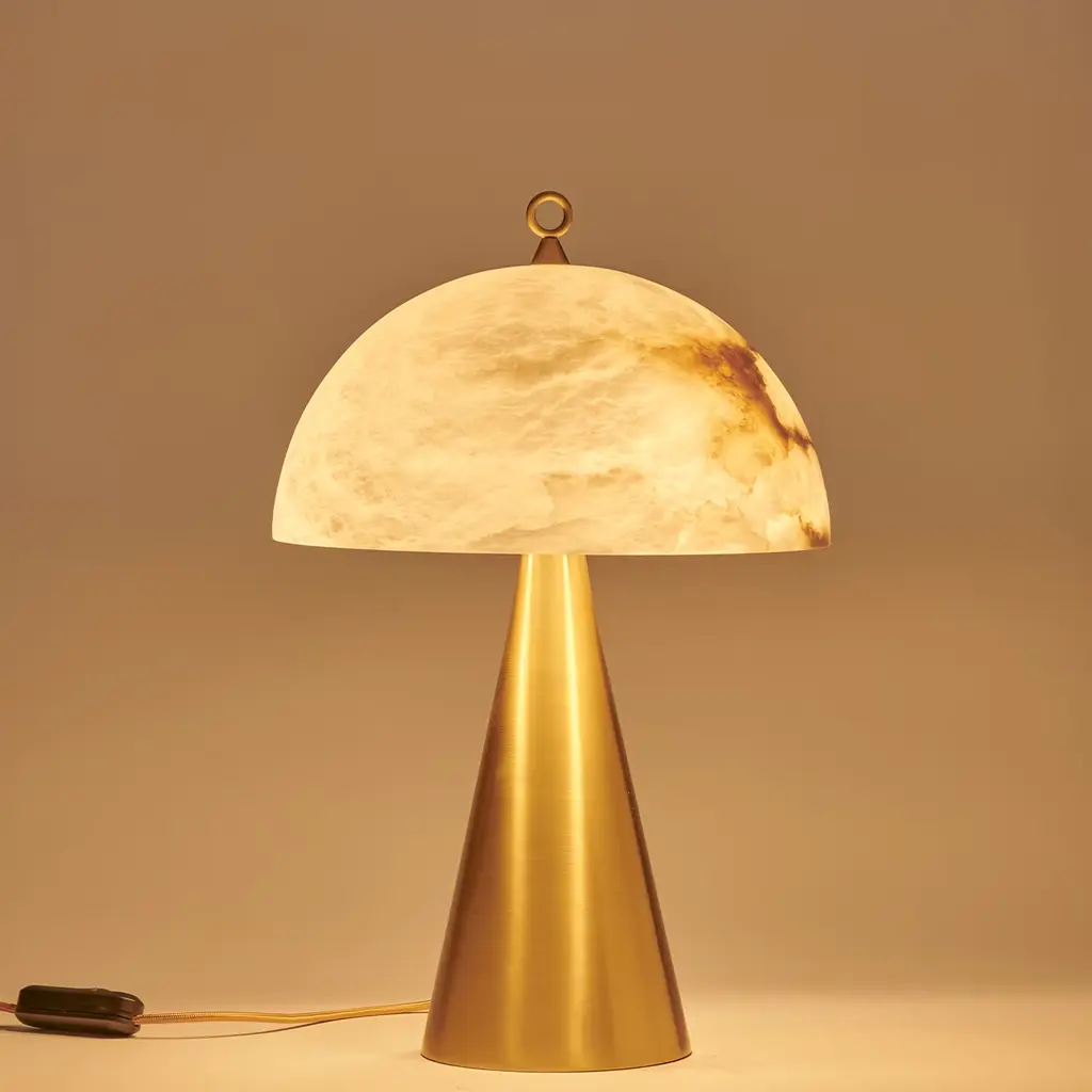 Born from the success of our Funghetto model, the Fungotto table lamp has larger and bolder dimensions, while maintaining the simplicity of its shapes. The semi-spherical alabaster lampshade, with its veins emphasized by the light, is completed by the luminous reflections on the conical brass base. The larger size allows it to be placed in larger environments that require the presence of an important piece with character.