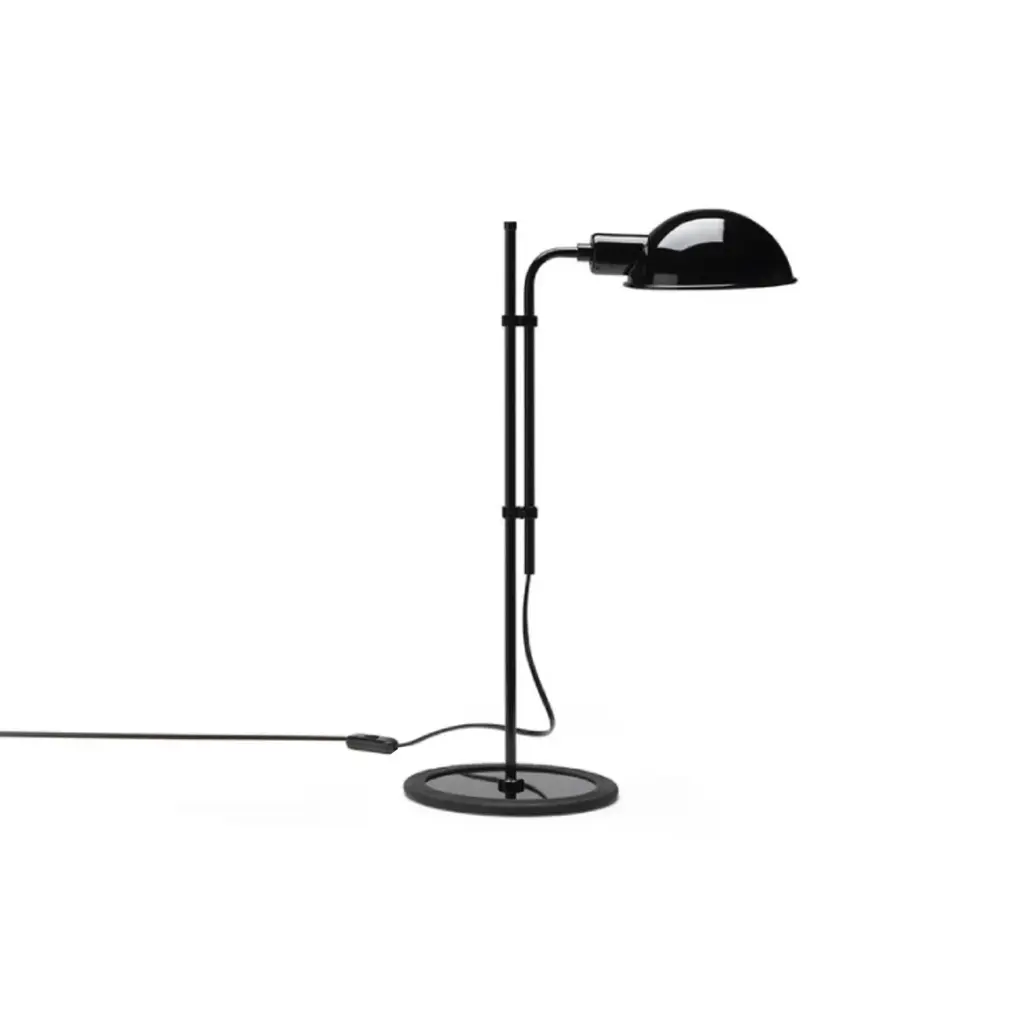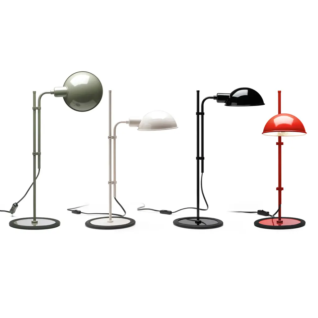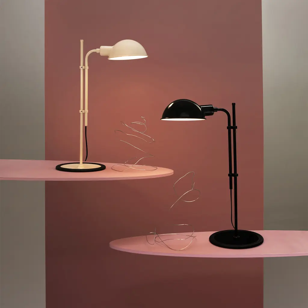 The table version of Funiculí, Spanish designer Lluís Porqueras' lamp concept that originated in 1979, expands on his notion of essential simplicity. Named for funicular up-and-down motion, the light moves similarly via a simple pair of clips. Meanwhile, the shade rotates 360 degrees to direct radiant light wherever needed, aimed downward for reading or upward for general reflected illumination. Base and stem of the lamp in lacquered iron with shade made of lacquered aluminum; a rubberized bottom adds stability to the lamp while protecting tabletops.