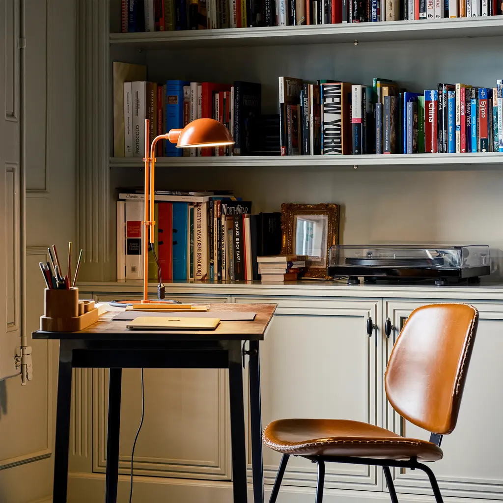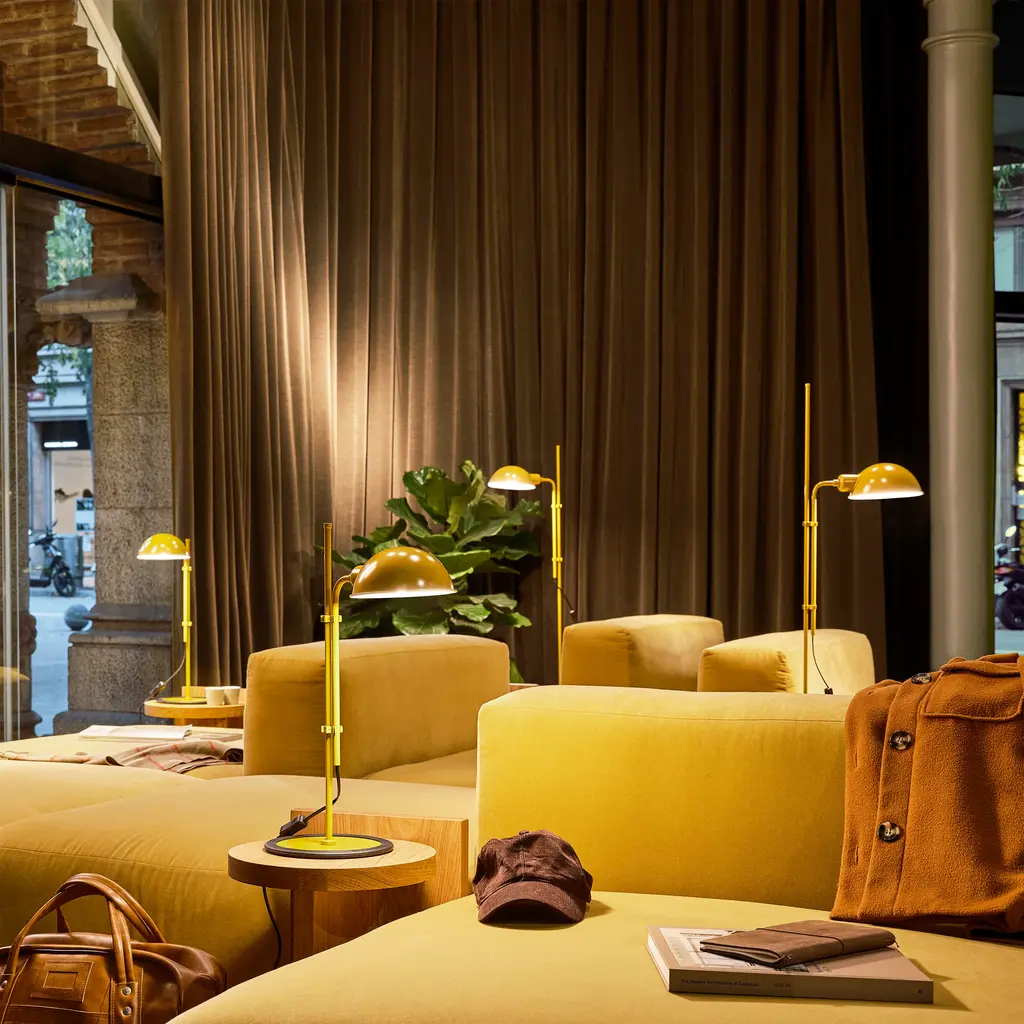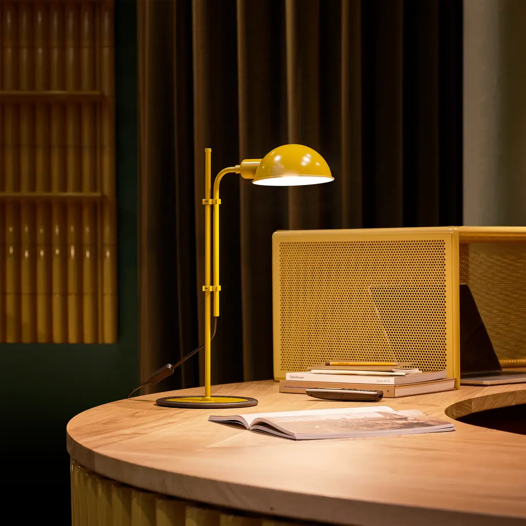 The table version of Funiculí, Spanish designer Lluís Porqueras' lamp concept that originated in 1979, expands on his notion of essential simplicity. Named for funicular up-and-down motion, the light moves similarly via a simple pair of clips. Meanwhile, the shade rotates 360 degrees to direct radiant light wherever needed, aimed downward for reading or upward for general reflected illumination. Base and stem of the lamp in lacquered iron with shade made of lacquered aluminum; a rubberized bottom adds stability to the lamp while protecting tabletops.