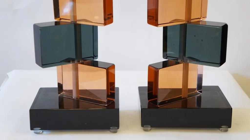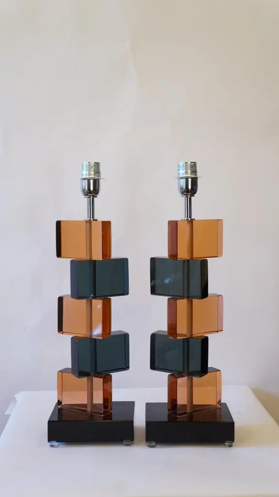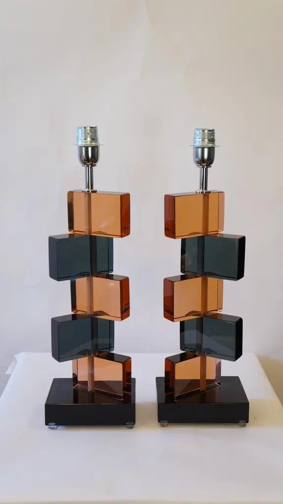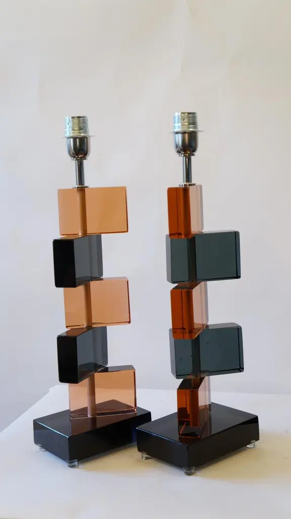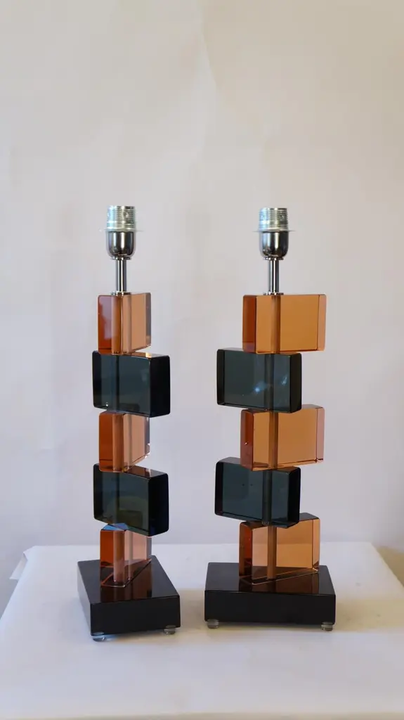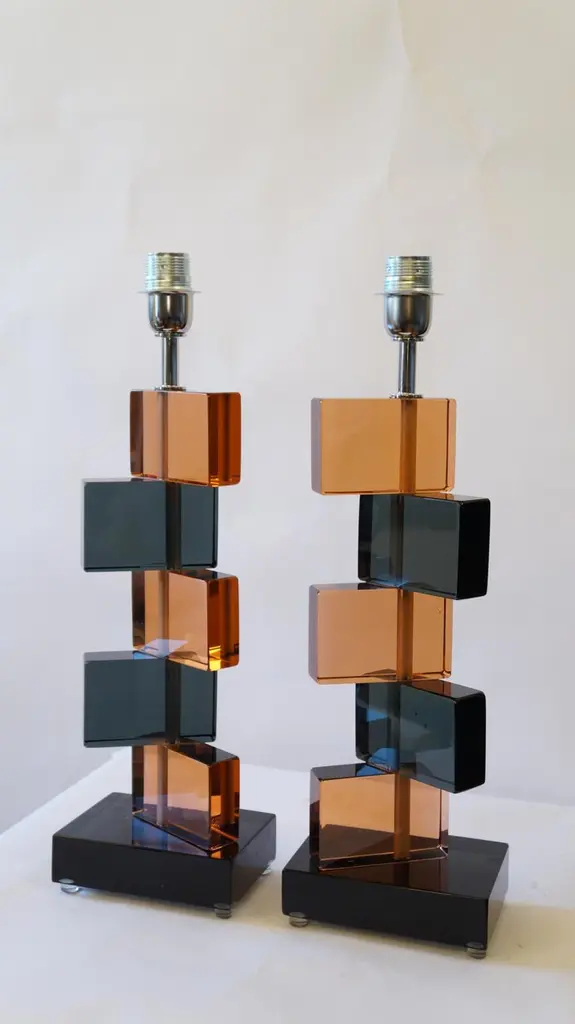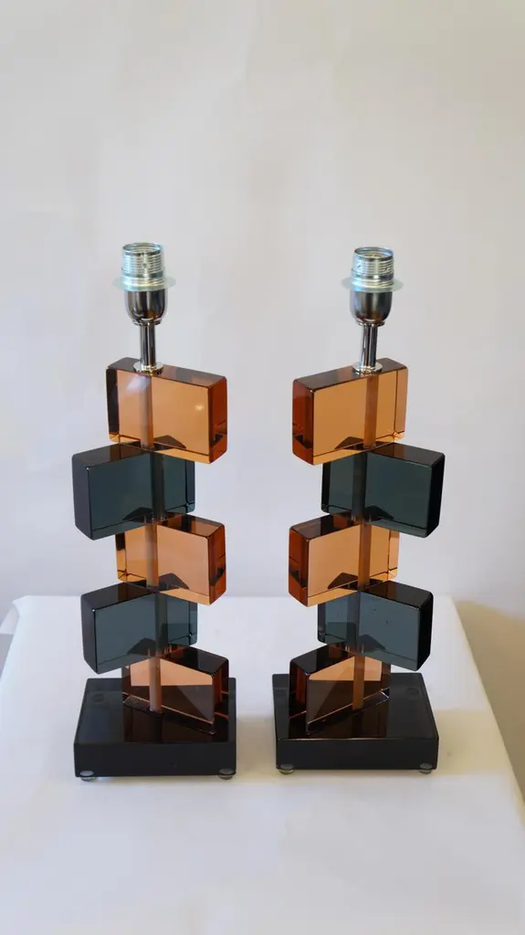 Two Murano glass table lamps by Alberto Donà in 1975.In it we can see simplicity, elegance, linearity. It is, in fact, a simple model, and it is thanks to its colors that its beauty stands out. We note in fact the combination of blue and salmon pink, almost complementary colors, which give a thin layer of extravagance to this lamp. It extends in height up to 54 cm, and rests its "colored blocks" in a rectangular base, 18 cm wide.The products are entirely handmade in style Mid-Century ModernThe price of the item includes professional and tailored packing.Lamps can be rewired for your country code.Engraved signature of the Master Glassmaker!