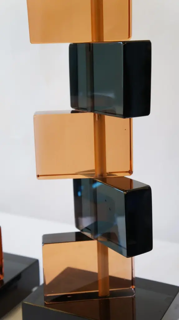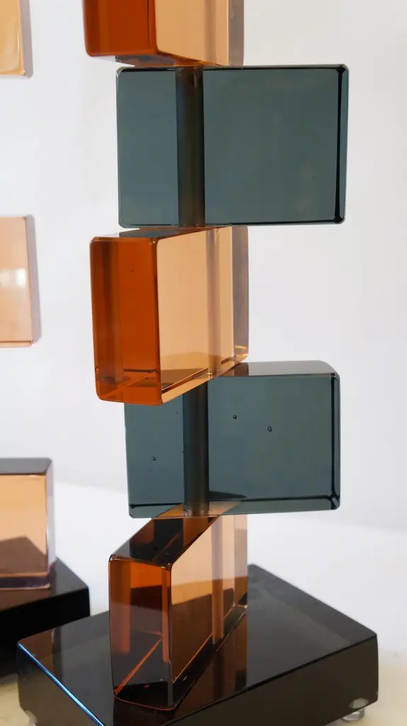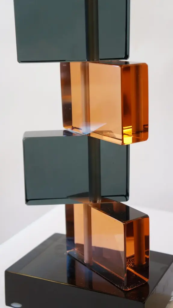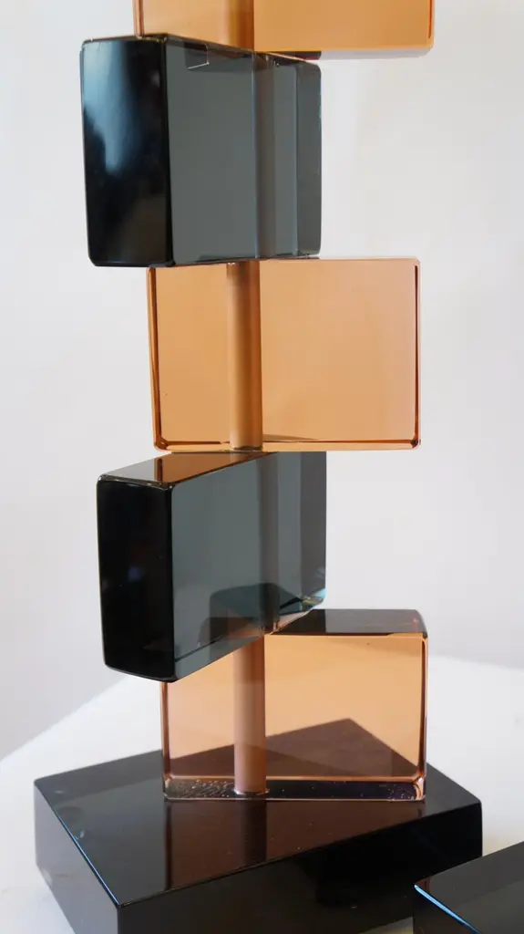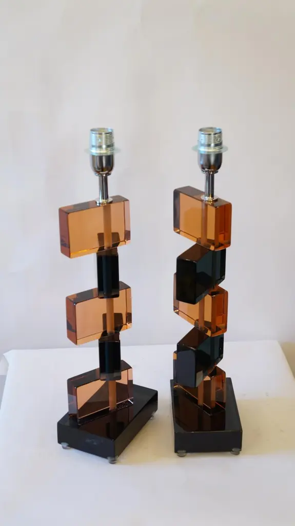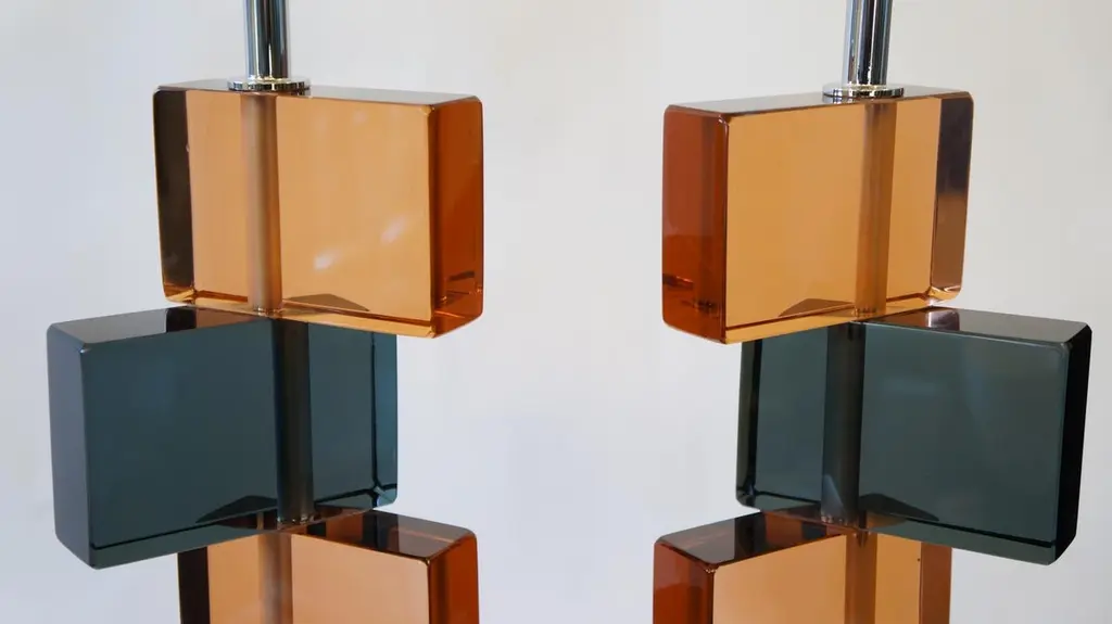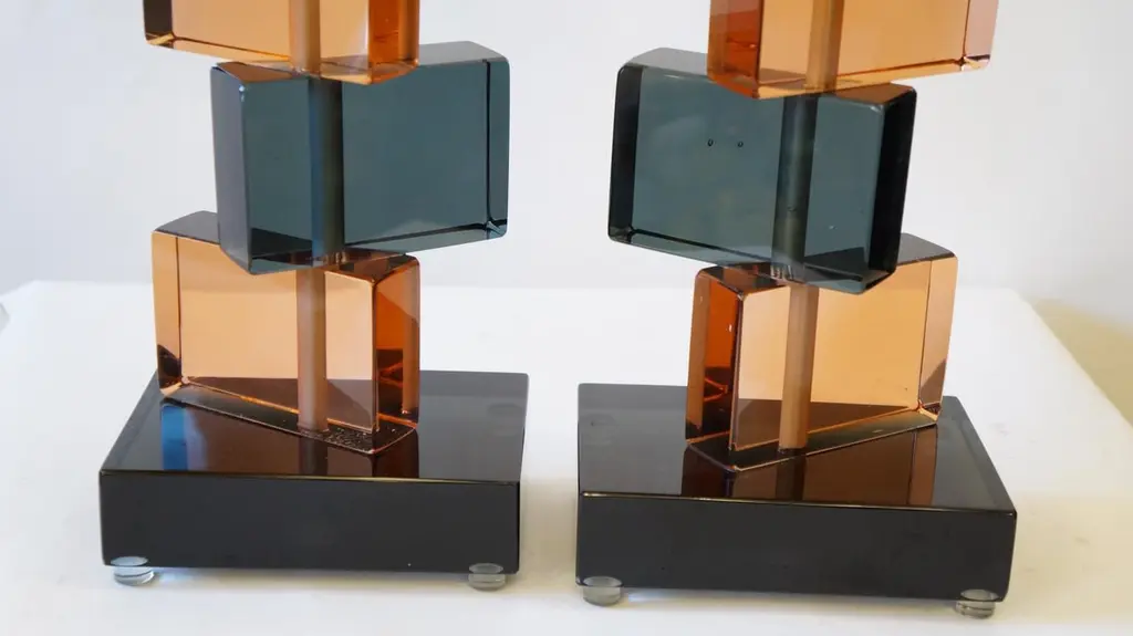 Two Murano glass table lamps by Alberto Donà in 1975.In it we can see simplicity, elegance, linearity. It is, in fact, a simple model, and it is thanks to its colors that its beauty stands out. We note in fact the combination of blue and salmon pink, almost complementary colors, which give a thin layer of extravagance to this lamp. It extends in height up to 54 cm, and rests its "colored blocks" in a rectangular base, 18 cm wide.The products are entirely handmade in style Mid-Century ModernThe price of the item includes professional and tailored packing.Lamps can be rewired for your country code.Engraved signature of the Master Glassmaker!