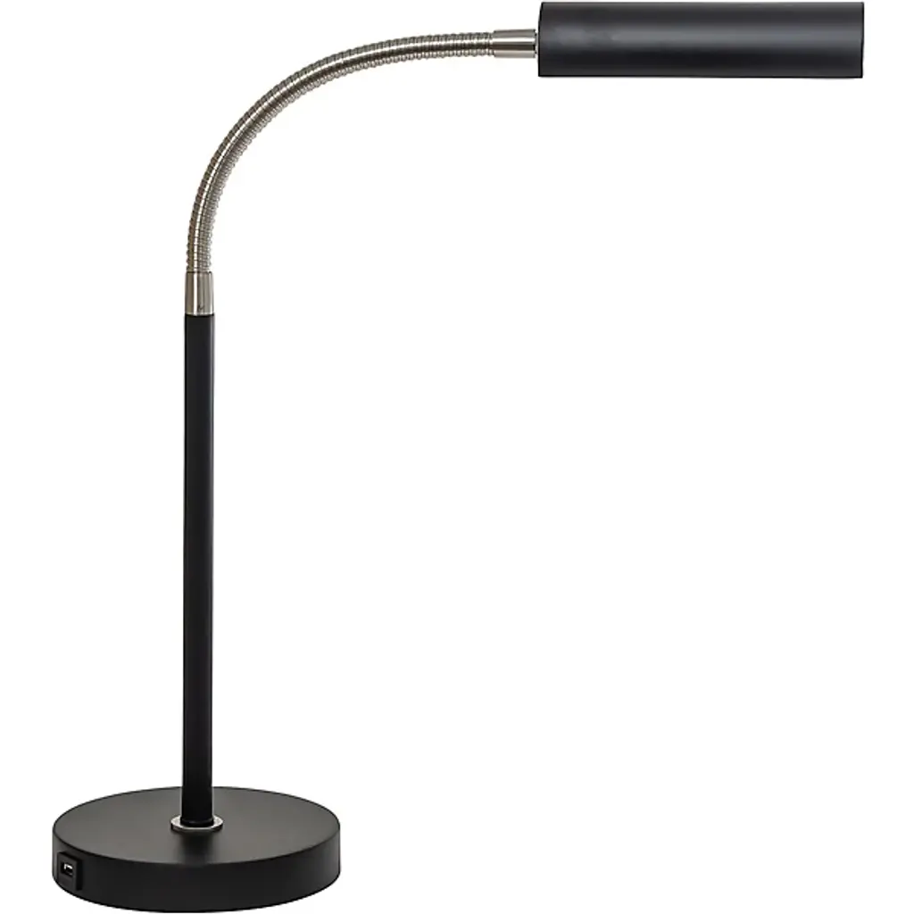 Enhance your workspaces with the smooth, simple style of the Fusion Table Lamp from House of Troy. A sleek disc base steadies the fixture, sending up a slim central stem to an adjustable gooseneck terminating in energy-efficient LED lamping set inside a cylindrical housing that narrows its spread. This lamping is powerful, posable, and easily oriented in any desired direction, whether as a direct pool of downlight for task use or slightly offset for indirect warmth.