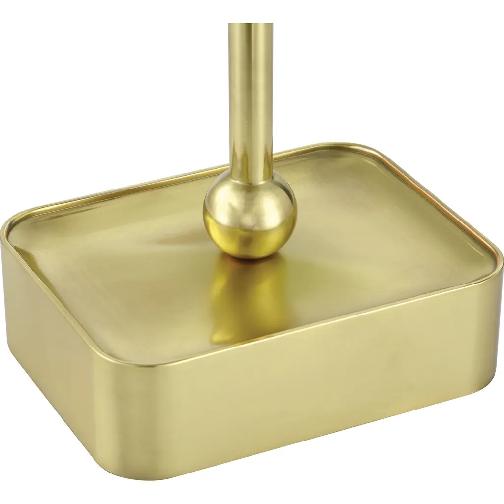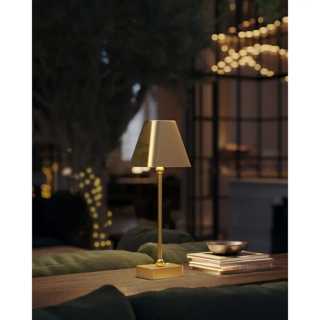 The Gadabout Brass Cordless Table Lamp is a gold lamp that gets around given its freedom to move. The rechargeable bulb sits atop the metal body in a brass finish, and the matching metal shade slides seamlessly over it. The on/off switch is on the top of the bulb, and the shade is finished on the inside for a luxe touch.