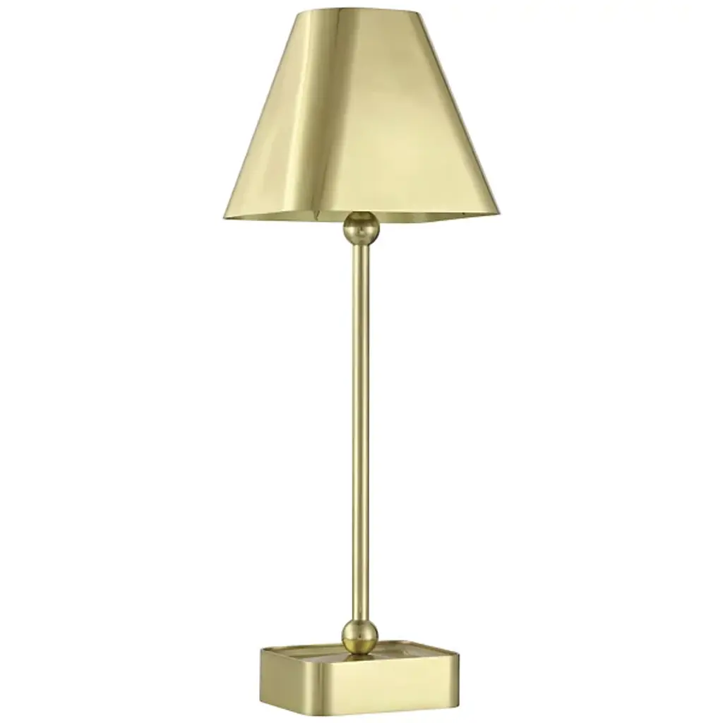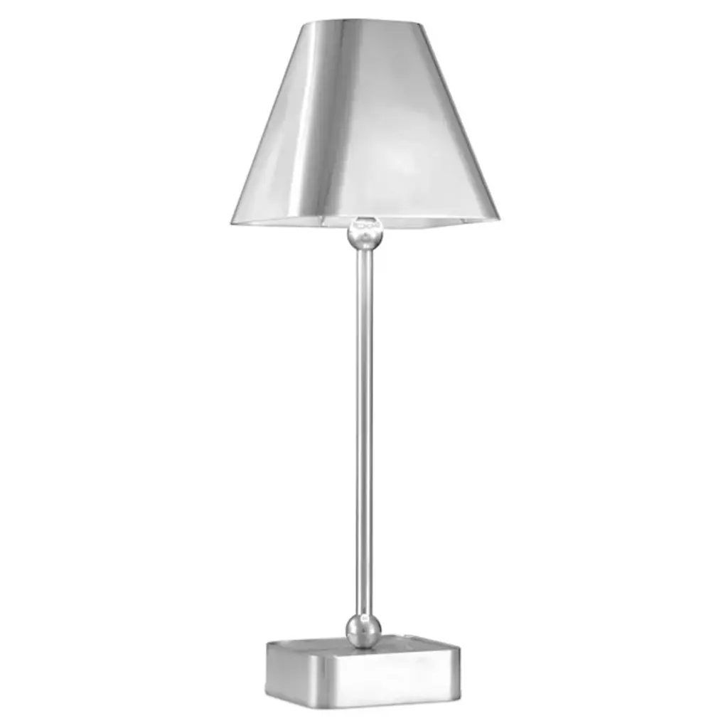 The Gadabout Cordless LED Table Lamp from Currey & Company features a liberating lighting design through its cordless innovation. Its rechargeable LED bulb nestles beneath the pyramid shade, both finished with premium metallic treatments inside and out. The on/off switch sits discreetly atop the bulb for easy access. This portable illuminator includes a charging base station, with additional battery options available separately. The lamp's refined proportions and expert craftsmanship make it an ideal companion for any surface requiring untethered lighting solutions.