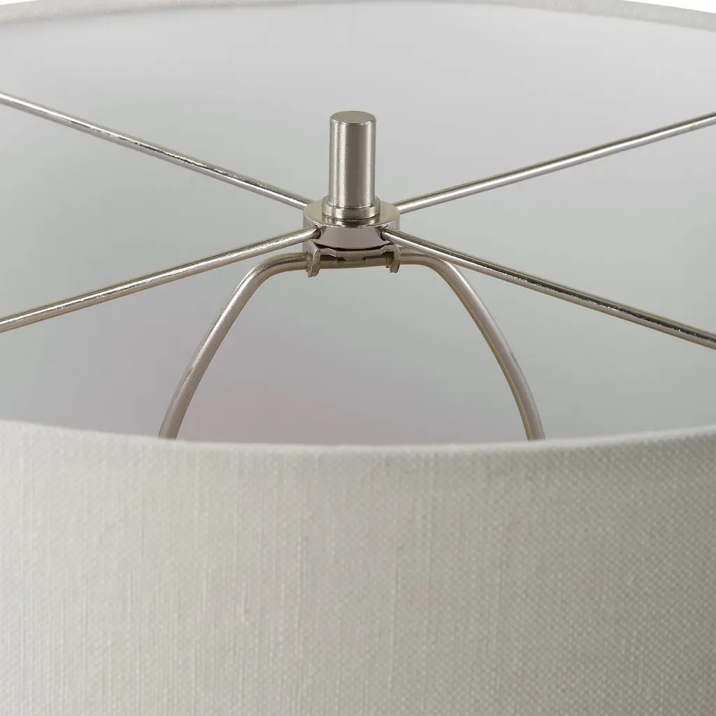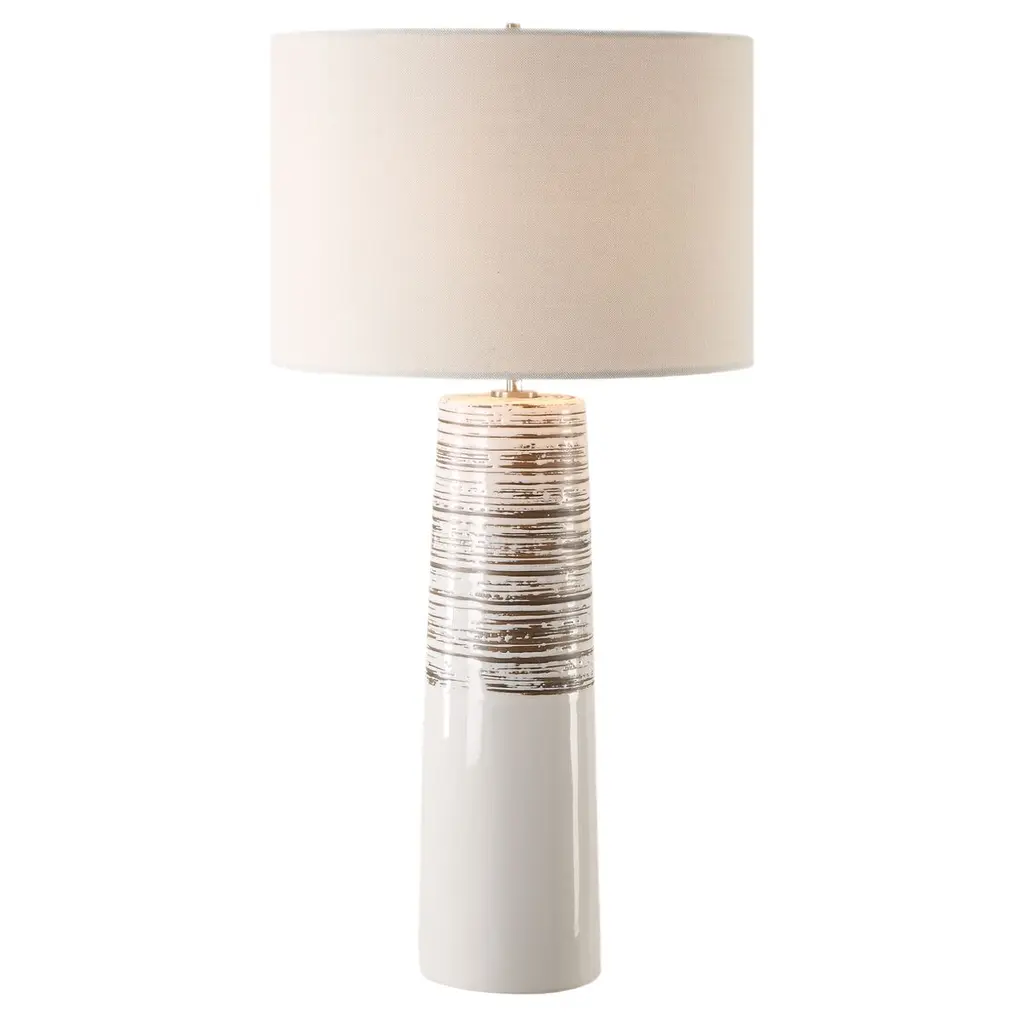 The Gaia Table Lamp exudes a perfect blend of elegance and rustic charm, making it a captivating addition to any space. Its sleek ceramic base, enveloped in a smooth glaze, is beautifully enhanced by subtly ribbed, distressed accents. This exquisite piece is further refined with brushed plated nickel hardware, adding a touch of sophistication. Topping off the design is a round hardback drum shade crafted from casual white linen fabric, offering a timeless appeal that complements any decor.