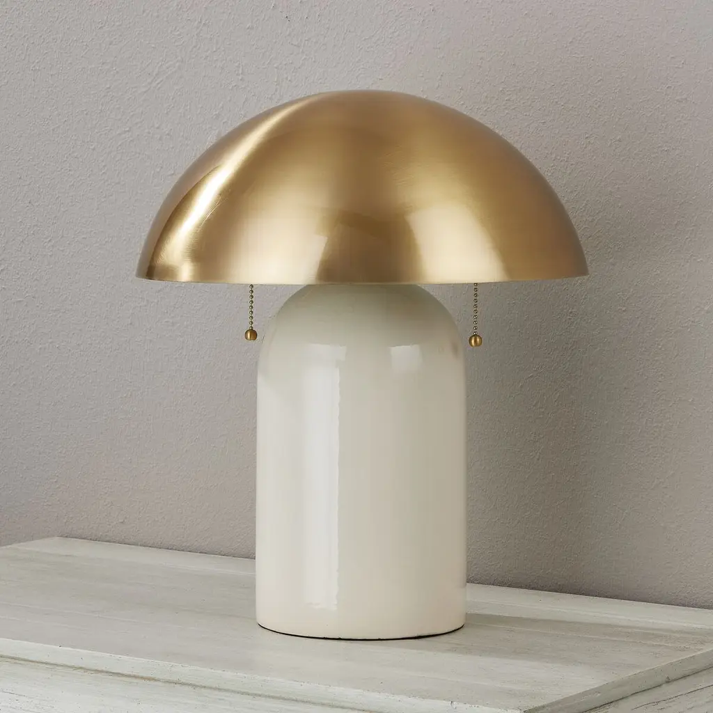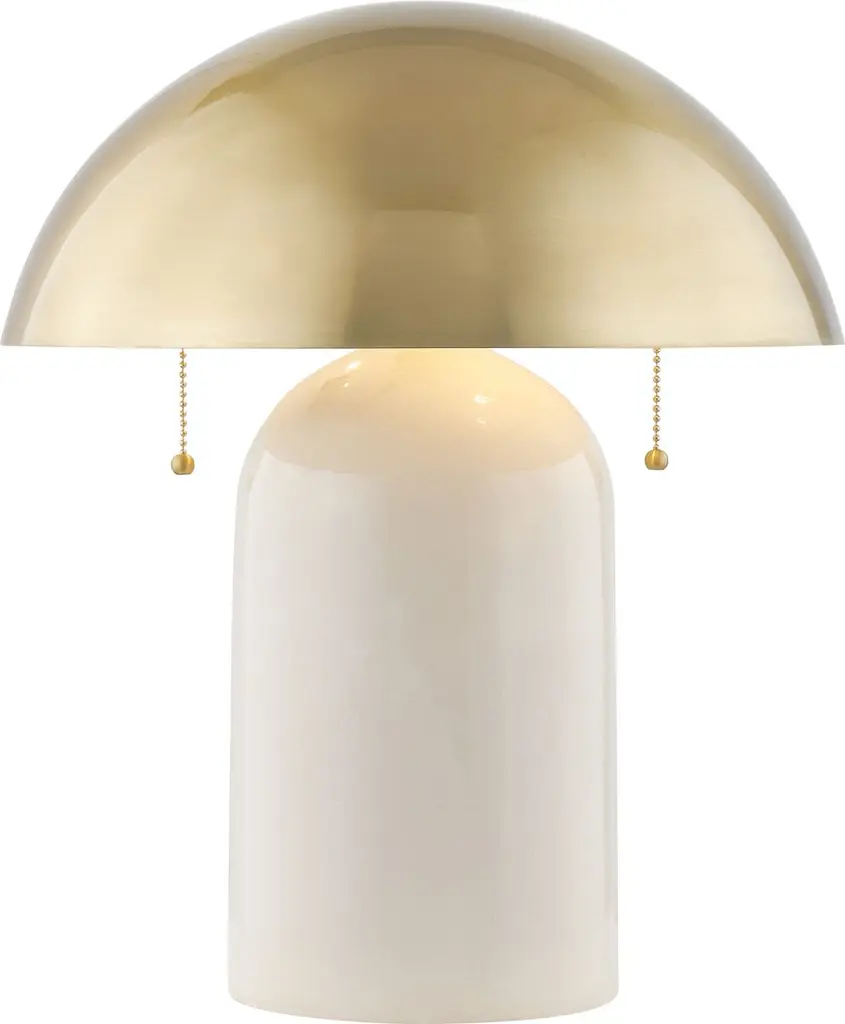 Domes and mushroom shapes are trending, and this two-bulb table lamp shows how chic they can be. The subtly crackled finish of the white ceramic body is a warm complement to the gleaming brass finish of the shade.