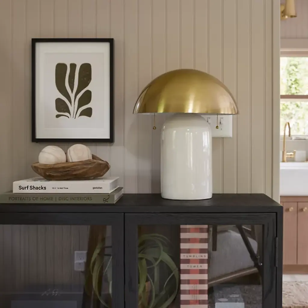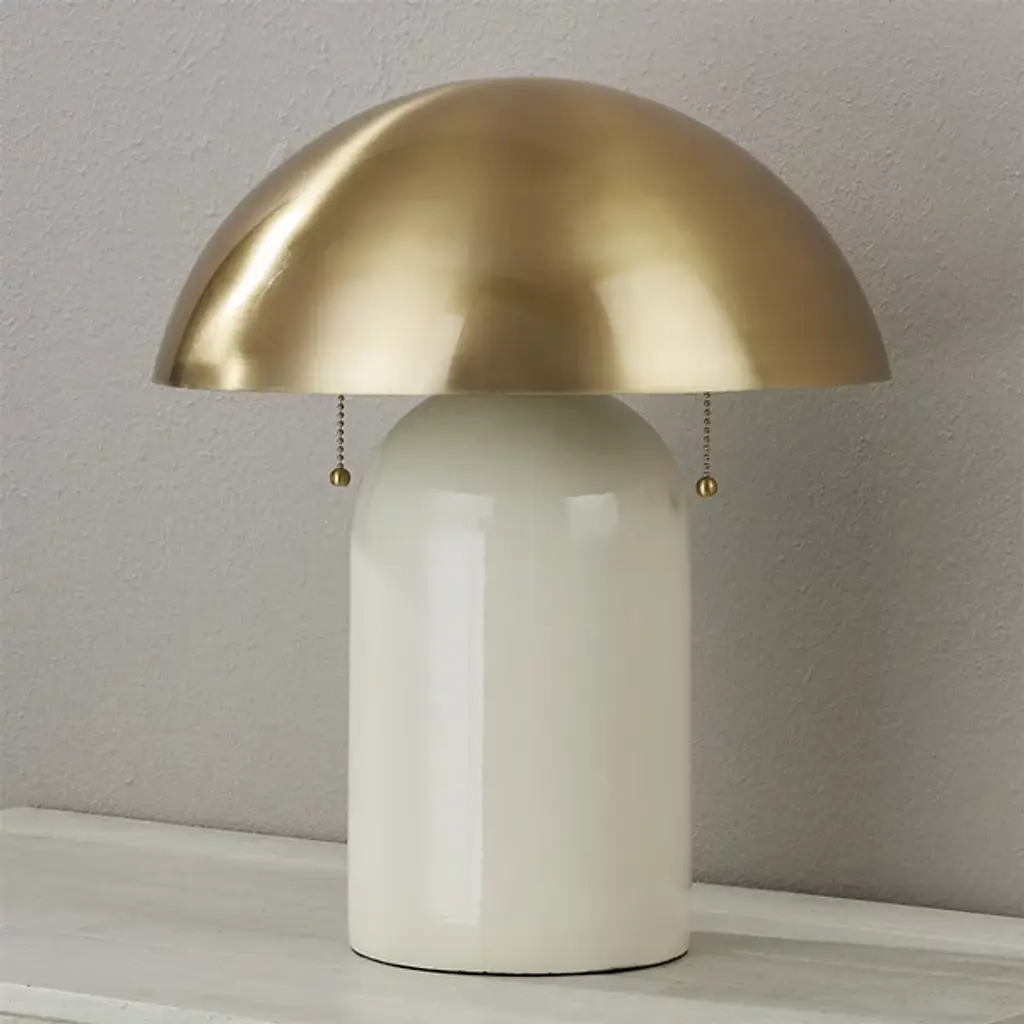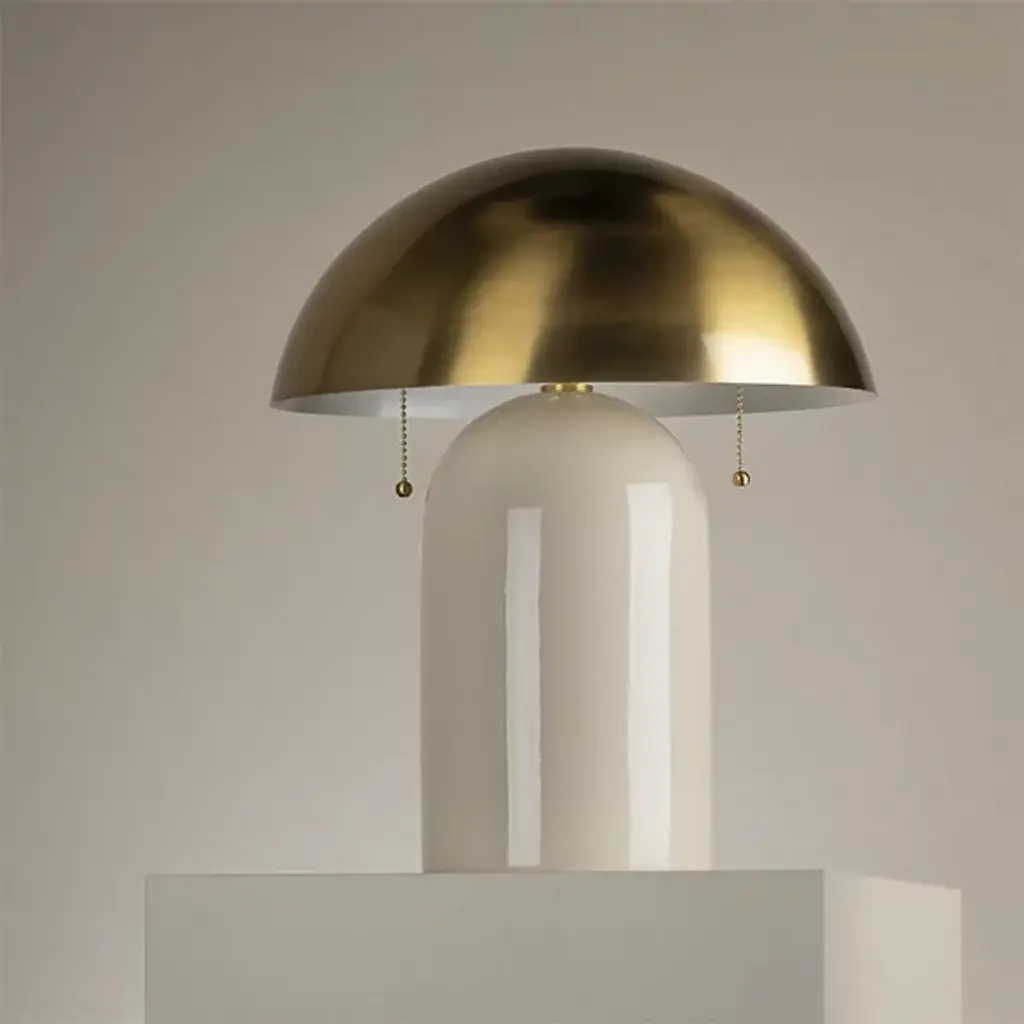 Presented by Mitzi, the Gaia Table Lamp was designed by Zio & Sons, a collective with reverence for vintage style, all while looking into the future to create pieces that will stand the test of time. This luxurious hand-crafted luminary features a smooth and squat mushroom silhouette while boasting decadent details, like aged brass shading, dual pull chains, and a ceramic base that has crackle glazing, creating a wabi-sabi-inspired aesthetic.