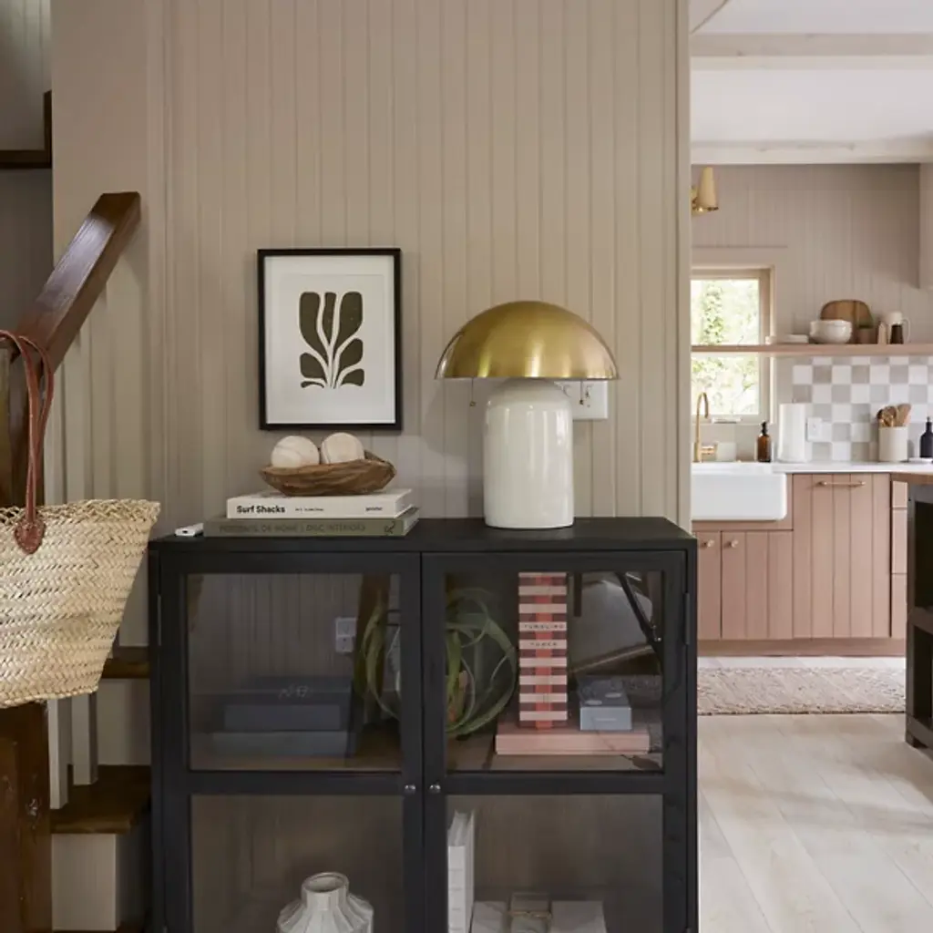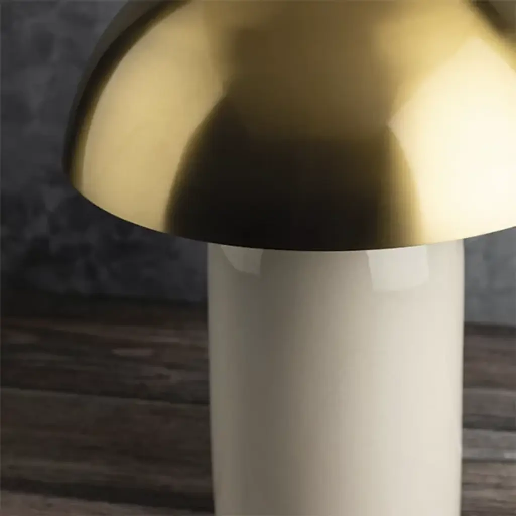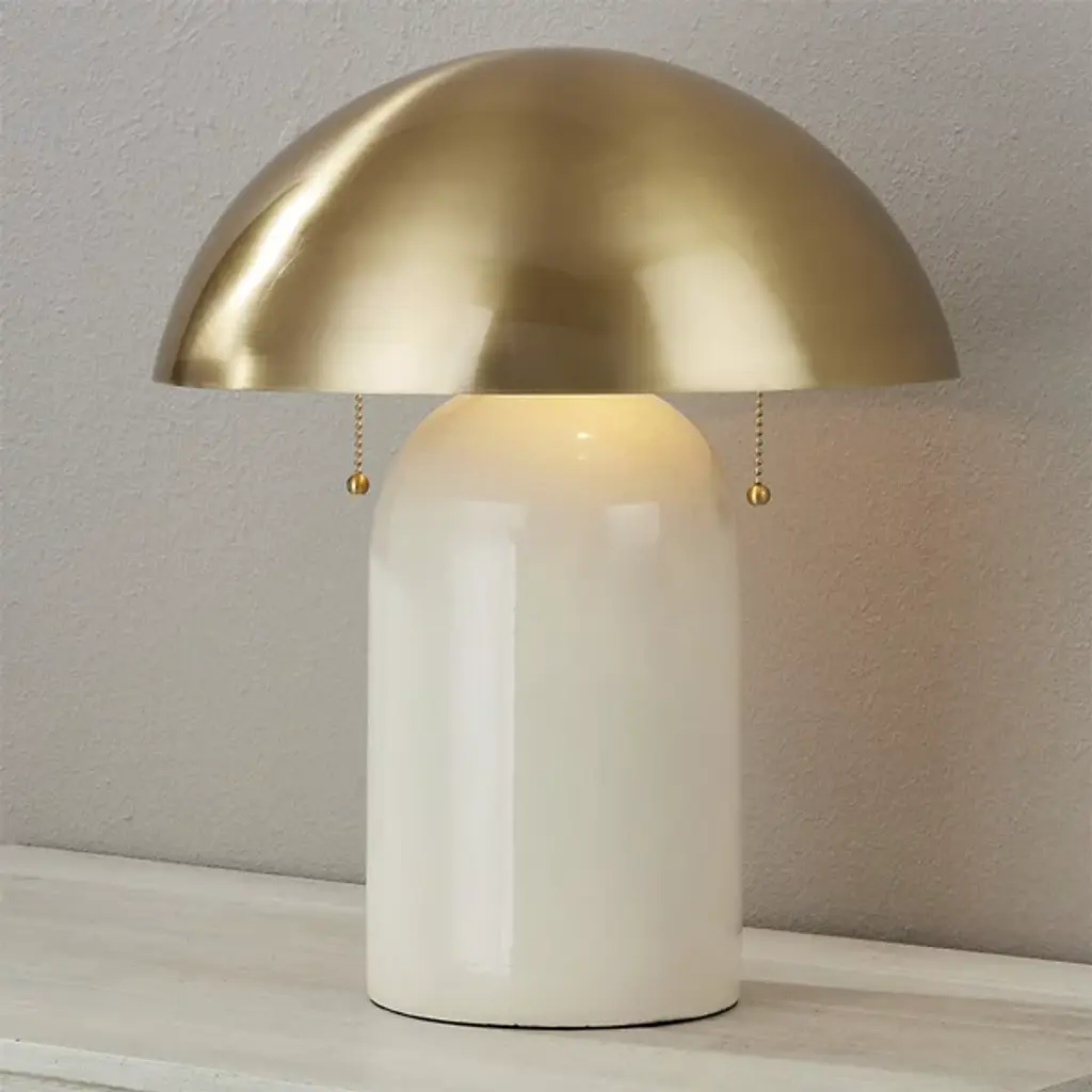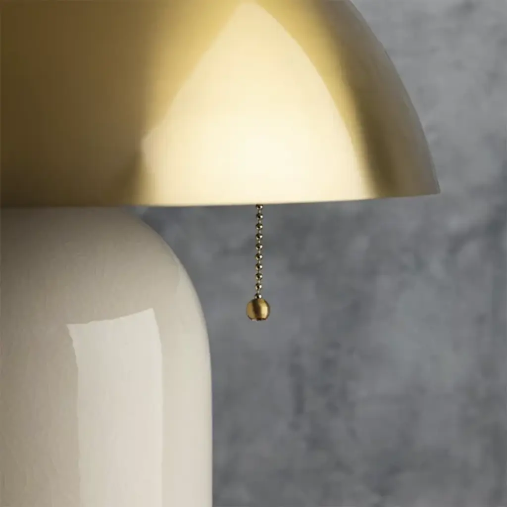 Presented by Mitzi, the Gaia Table Lamp was designed by Zio & Sons, a collective with reverence for vintage style, all while looking into the future to create pieces that will stand the test of time. This luxurious hand-crafted luminary features a smooth and squat mushroom silhouette while boasting decadent details, like aged brass shading, dual pull chains, and a ceramic base that has crackle glazing, creating a wabi-sabi-inspired aesthetic.