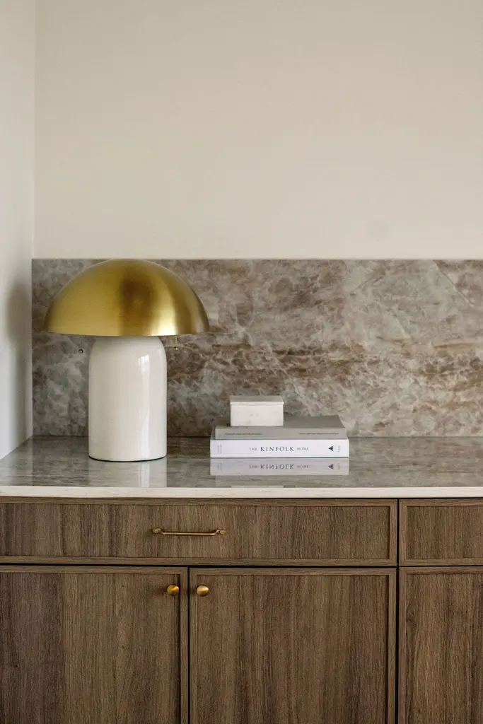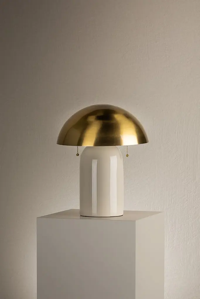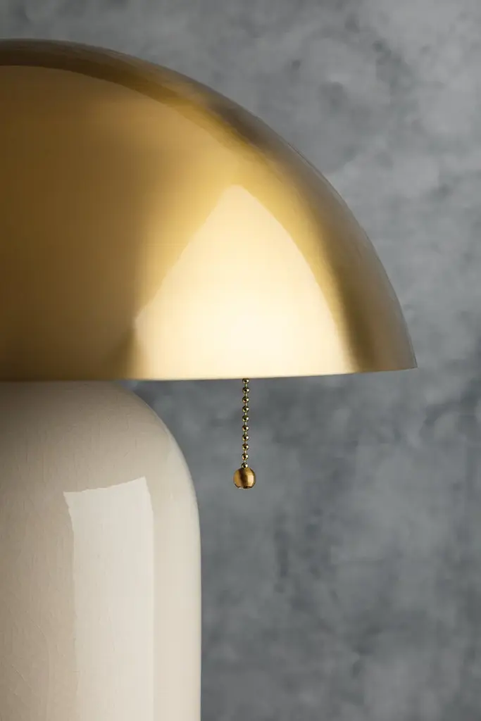 Gaia elevates the everyday table lamp, infusing modern sophistication into any space. An oversized, antique brass dome shade steals the show, shining brilliantly against the ceramic base. Hand-crafted details like the white crackle glaze lend a wabi-sabi quality to the otherwise polished design. Functional pull chains reference the iconic banker's lamp, bringing the revered design into the future.