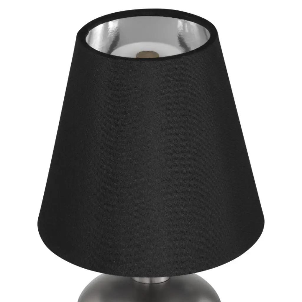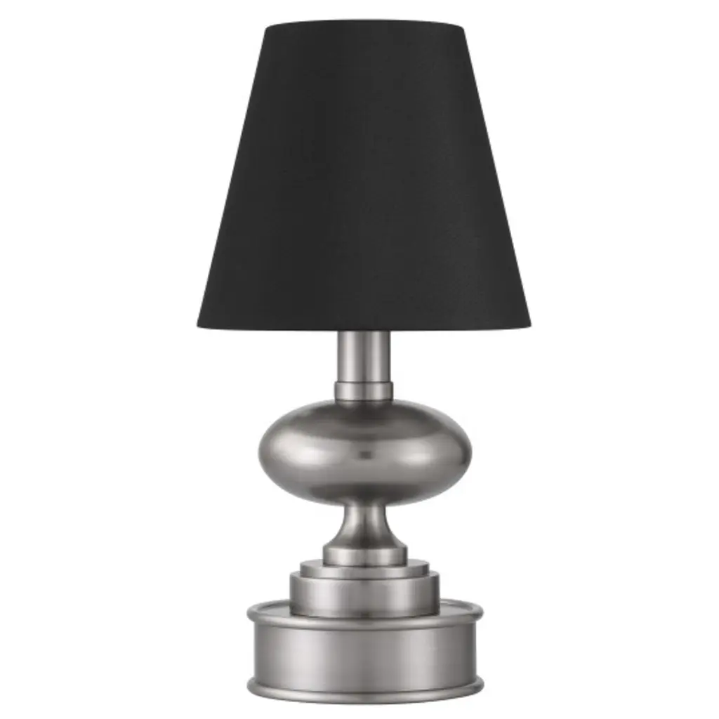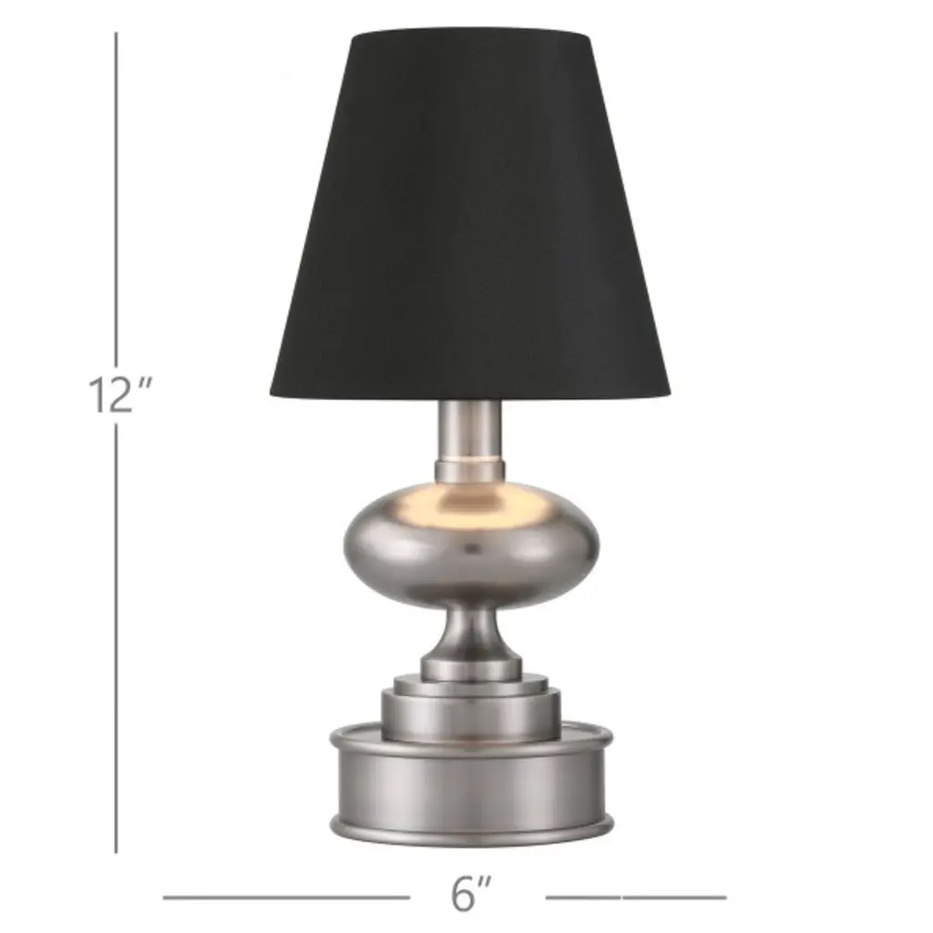 The Galavant Cordless Table Lamp is a petite lamp that makes movement a breeze. The rechargeable bulb sits atop the metal body, and the black shantung shade slides seamlessly over it. The on/off switch is conveniently located on the top of the bulb, and the shade has a foil lining for a luxe touch.