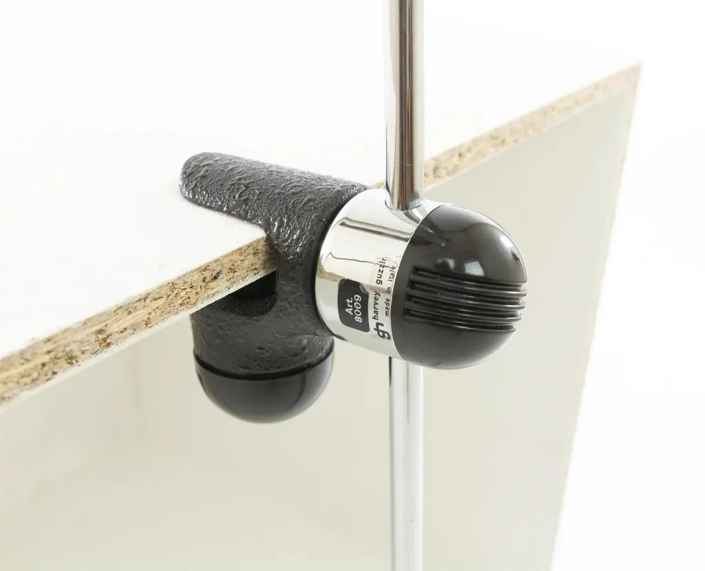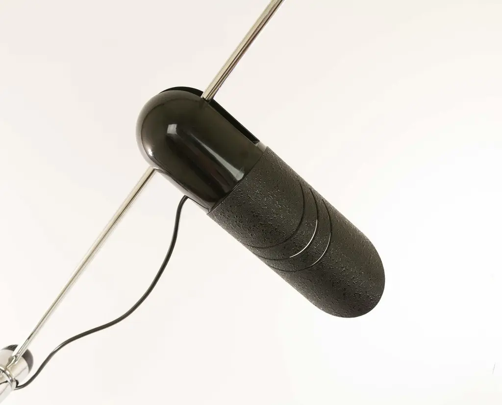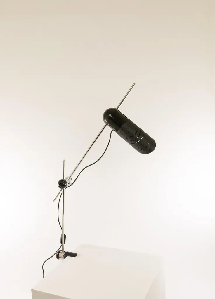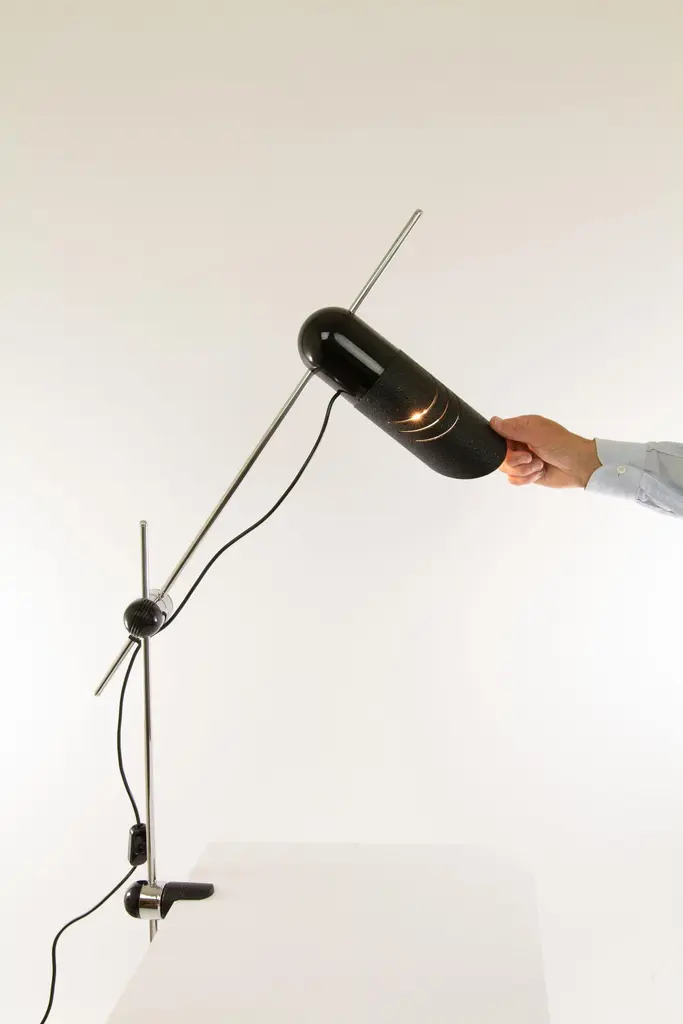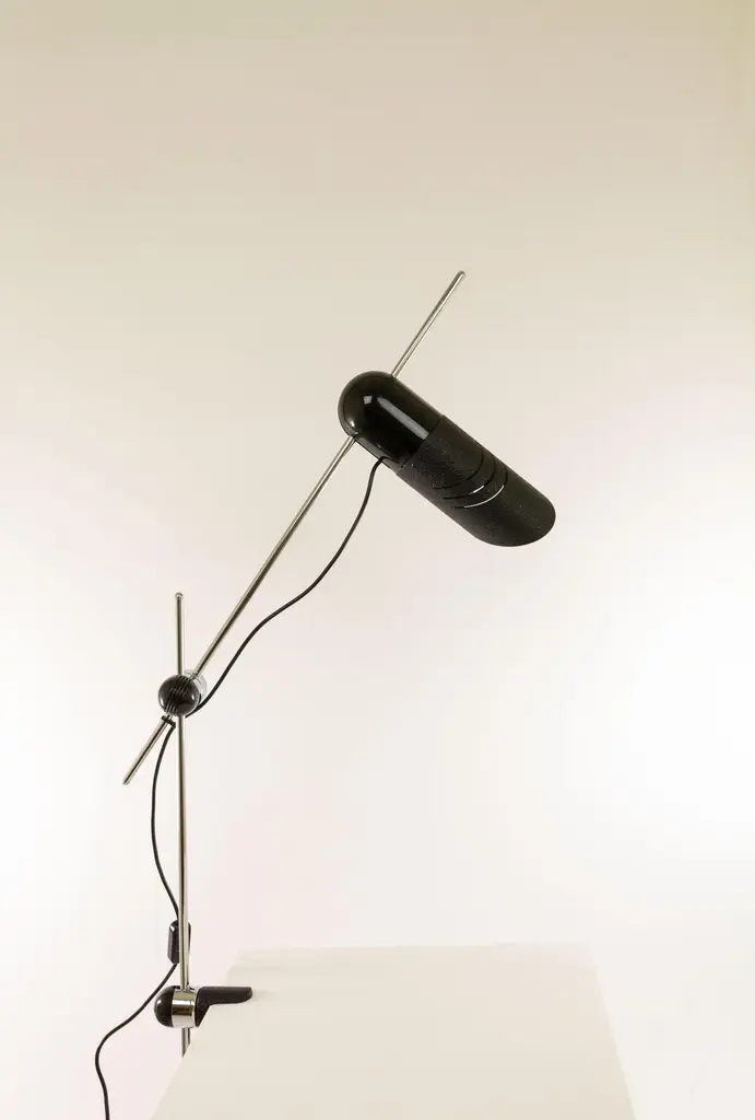 Galdino table lamp that was designed by Carlo Urbinati for Harvey Guzzini in 1972.Galdino has been produced in many versions; a table lamp, a wall lamp and a floor lamp (with one and with two spots). This is the rare clamp lamp which can by attached to e.g. a table top or a shelf.The stems are chromed and the tubular lampshade is made of black painted aluminium, with three slits. The lampshade is adjustable in height.We have another -different- Galdino clamp lamp and a Galdino floor lamp in our collection. They can all be combined liberally.Two pieces of this model available. Price and shipping costs are per piece.