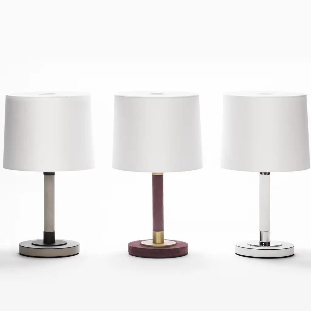 An exercise in formal and aesthetic harmony, the Gallia Table Lamp will complete any decor with glamour and modern-chic allure. The wooden round base and stem are covered with leather in a stone hue and detailed with bronze-plated metal complementing the white cotton shade. Additional features include fireproof diffuser and an in-line footswitch. Illumination is provided by a single E14 light bulb max 100W (not included). Available also with chrome and brass finish.