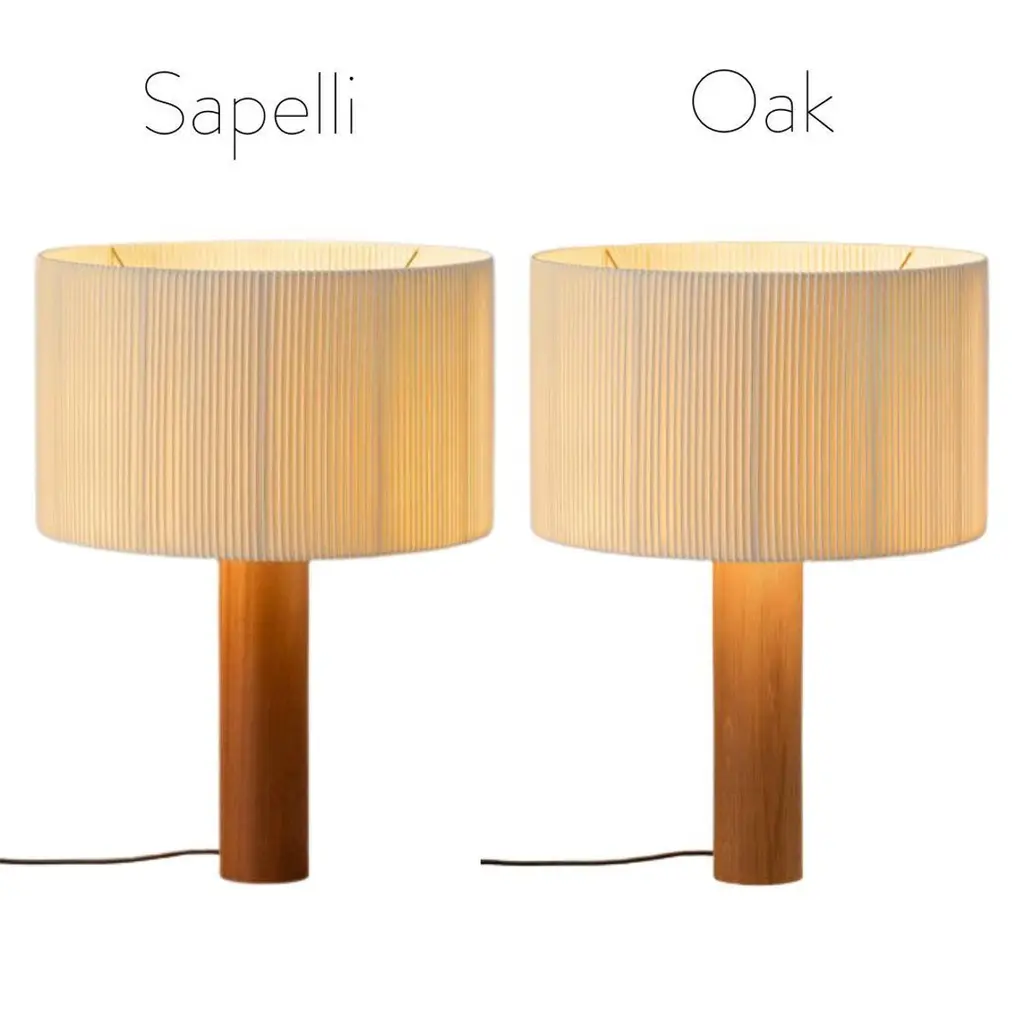 Gallissa 'Moragas' table lamp in sapelli wood & natural cotton for Santa & ColeFounded in 1985 in Barcelona, Santa & Cole produces iconic pieces by such luminaries as llmari Tapiovaara, Miguel Milá and other European icons with a commitment to faithfully re-edition their legendary designs with uncompromising attention to detail, materials and craftsmanship.The 'Moragas' table lamp was designed for Moragas' own office in 1957. Featuring a shade in natural cotton ribbon, typically used for bookbinding, Moragas would often place notes and cards between the shade's ribbon folds. The generously sized shade is arranged atop a sturdy wood cylinder base with a brass head that supports 3 bulbs in a radial and outward arrangement. Today the 'Moragas' continues to be meticulously crafted to Santa & Cole's exacting standards using the highest quality materials available.Price per item. Available in unlimited quantities with a wood base in oak or sapelli. This listing is for the 'Moragas' table lamp in sapelli wood, brass and a natural cotton shade.In stock lead time 1-2 weeks. Out of stock can add an additional 4-8 weeks or more. Please note that lead times and inventory availability are dependent on choice of wood and are subject to change without notice. Please inquire for current lead times prior to placing time sensitive orders. Kindly note that items must ship from Santa & Cole’s Barcelona warehouse, so 1st Dibs arranged shipping and local pickup are not available. Shipping cost quoted is per item and cannot be combined. Free standard shipping on all lighting orders less than $17,000.Illuminated via 3 standard medium base E26 bulbs (not included). Recommended bulb 12 watt dimmable LED (lower with incandescent). Powered by 7.3' black cord with integrated dimmer switch. This lamp is UL listed and IP20 rated.Made to order. All sales are final.