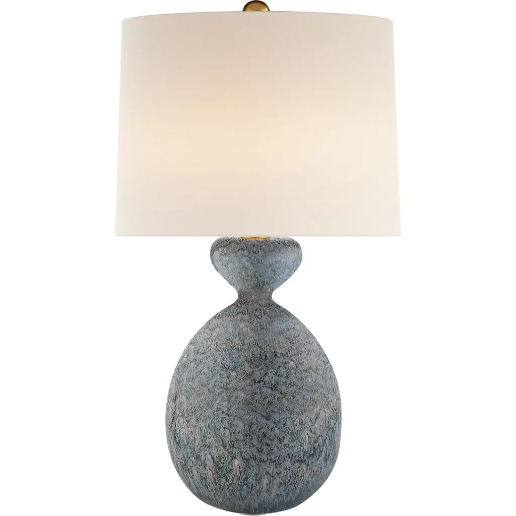 Give the console or nightstand a fresh new perspective with this curvy table lamp, finished in a layered blue glaze. A linen drum shade completes the design.