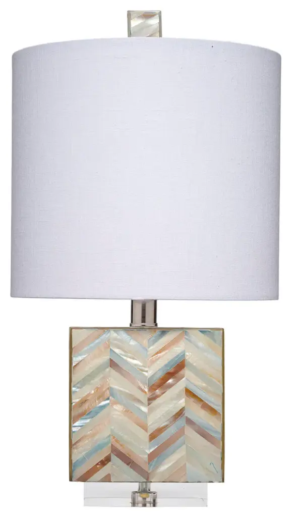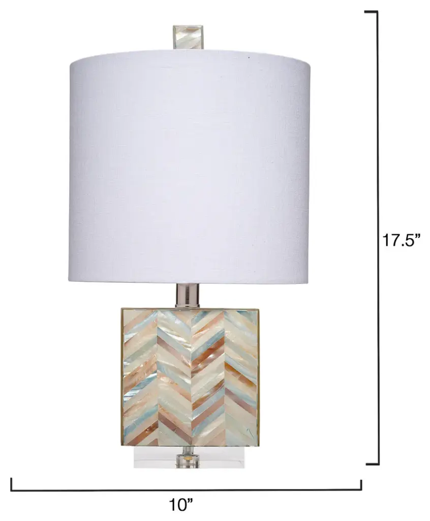 Unashamedly glamorous, this jewel-like table lamp''s art deco influence is a delight to behold. It is supported by a slice of crystal-clear acrylic, and its handcrafted base and finial are created with artfully applied strips of luminous mother-of-pearl. A white linen drum shade seems to float above it all. We love this in a bedroom or dressing area!Handcrafted of natural Mother of PearlDrum Shade, 100% White Linen, Rolled EdgeAcrylic Base: 0.75"H x 4.5"W x 4.5"D2"H Rectangle Mother of Pearl Finial7.5" Silver Harp, Silver SpiderMother of pearl is the iridescent substance that forms the lining of the shells found in both fresh water and salt water mollusks. The inherent variations in tone and texture found in Mother of Pearl are preserved, to create pieces rich in detail and natural beauty. These unique imperfections give our products character and individuality, with each piece having its own personality. Lamp Dimensions: 11"H x 5.5"W x 5.5"DShade Dimensions: 9"H x 10"W x 10"D1 bulb required; Bulb Not Included60 Max Wattage, Volts 120E26 Bulb Base Type 8 FT Clear Cord 1-Way Rocker Switch In LineNot Damp RatedCare Instructions: We do not recommend using harsh or abrasive cleaners at any time as they can damage product. Wipe surfaces gently with soft, dry cloth. If needed, you may use a lightly damp cloth with water only on base.