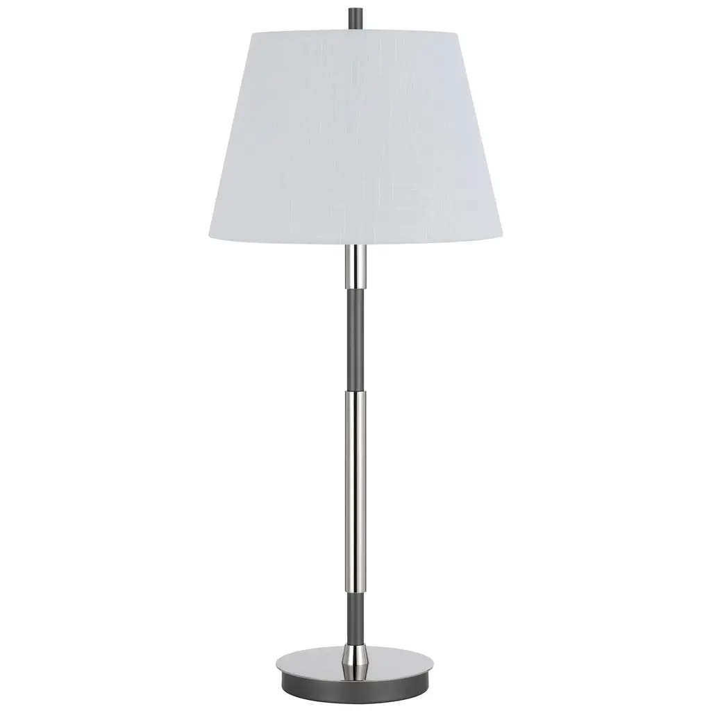 Supple leather detailing gives this adjustable table lamp a tailored feel, offset by a slender brass body. A white empire shade rests above.