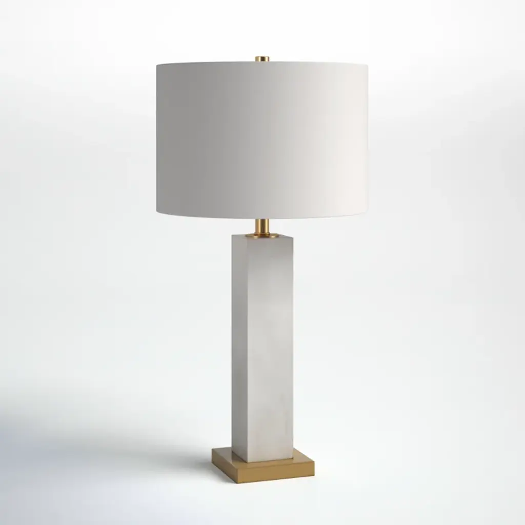 The Gatlin Table Lamp is crafted of Marble and Metal in a White Marble and Sand Bronze Finish with a white linen drum shade.