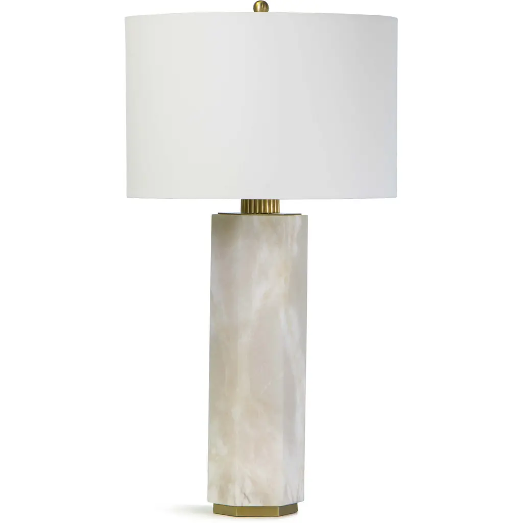 The balanced geometry of a hexagon, extended into a modern column light, our Gear alabaster table lamp's sophisticated profile makes a simple yet contemporary statement. Natural brass hardware and a natural linen shade perfectly compliment the lamp's angular silhouette.