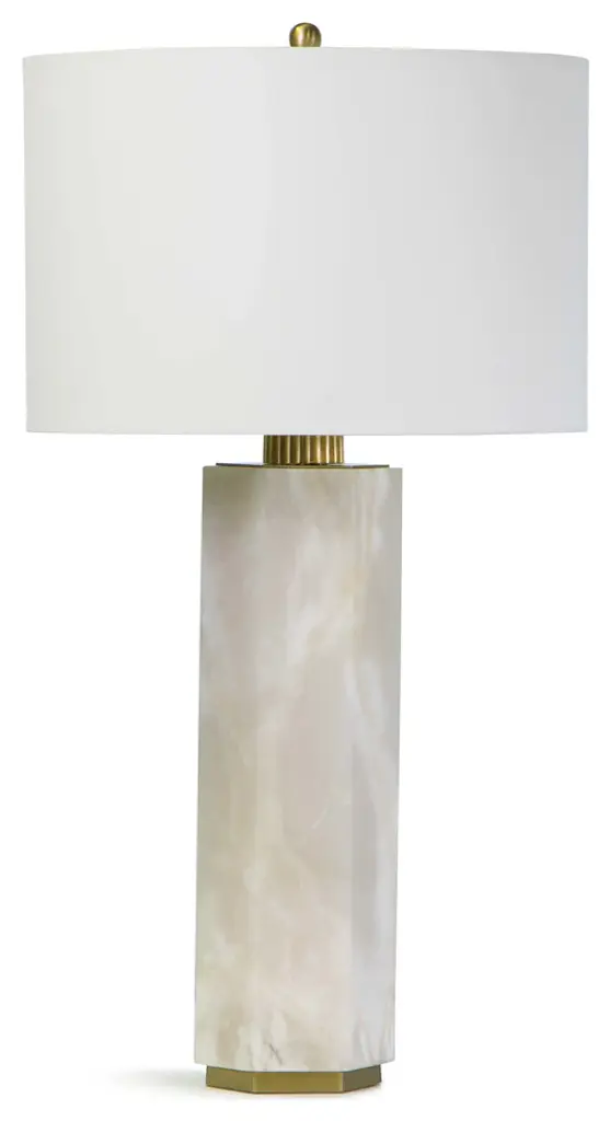 The balanced geometry of a hexagon, extended into a modern column light. Our Gear alabaster table lamp sophisticated profile makes a simple yet contemporary statement, fitted with natural brass hardware and topped with a natural linen shade that perfectly complements the lamp''s angular silhouette.Bulb Type: A Type Medium Base (E26)Wattage: 3-Way 150 Watt MaxNumber of Bulbs Needed: 1Bulb Included: No