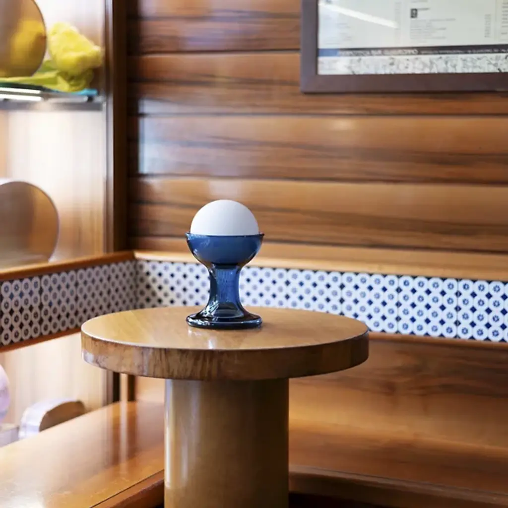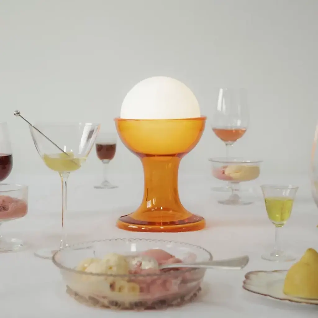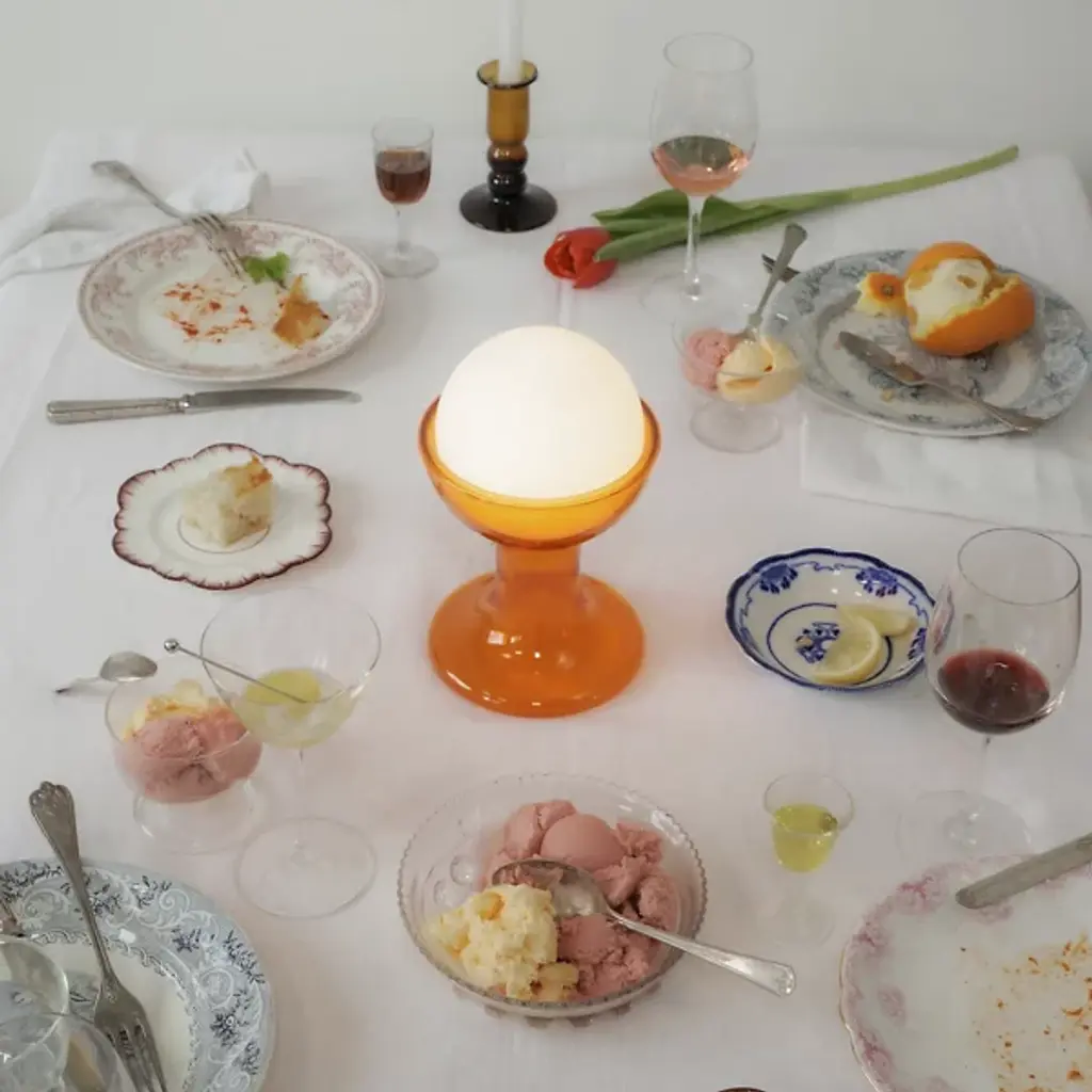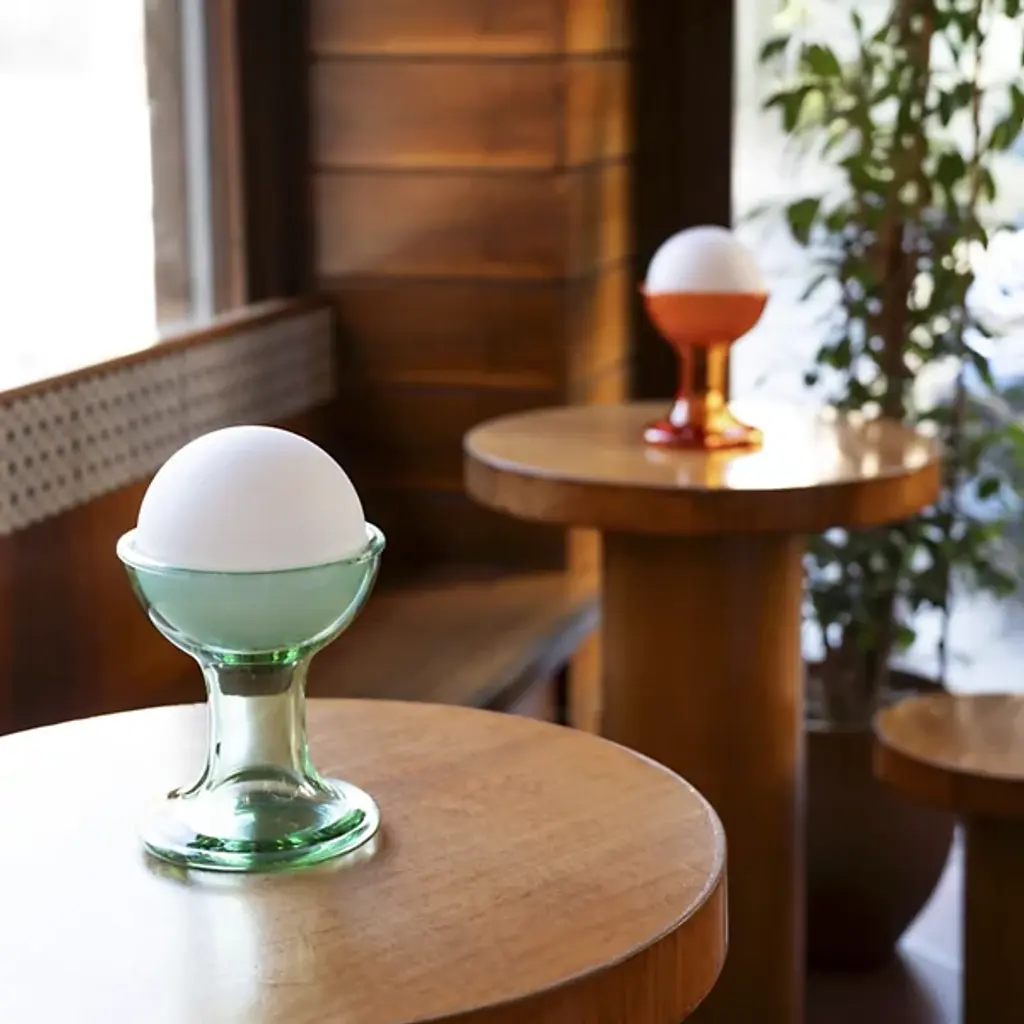 The Gelato Rechargeable LED Table Lamp from Established & Sons showcases artisanal modern style with a refined yet playful appearance. Designed by Carlo Nason, it draws inspiration from the beloved Italian treat, pairing a colorful glass “cup” with a frosted glass orb that glows from within. The freestanding orb houses a custom, replaceable LED bulb with an integrated battery and a haptic three-step dimmer for effortless control. Portable and easy to recharge, it connects directly via a USB-C magnetic cable, blending charm with modern functionality.