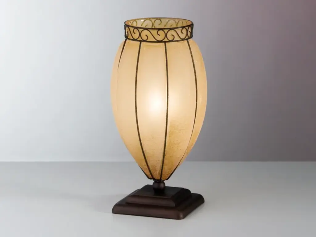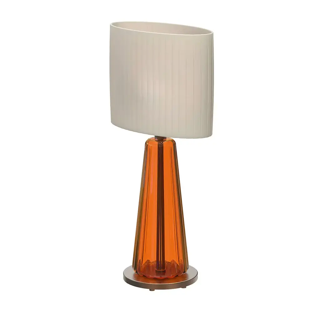 A glossy stainless steel frame distinguishes the modern look of this table lamp, comprised of a round base and of a cage whose thin, sinuous rods embrace a precious diffuser in mouth-blown, amber-hued Murano glass. The design reveals a sophisticated inspiration from organic shapes with its silhouette splendidly diffusing the light emitted from within. Due to handcrafting, slight changes in metal's finish may occur.