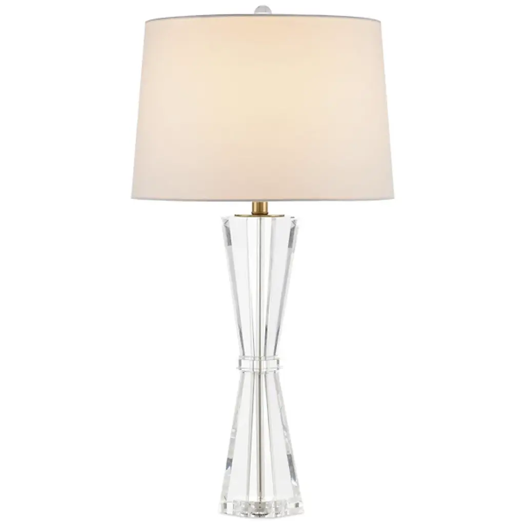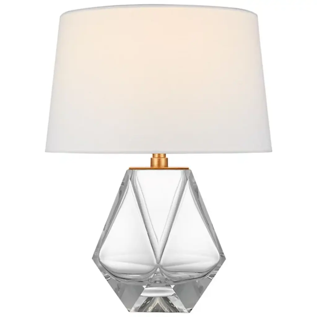 Accentuate interior spaces with the sleek appeal and refined design of the Gemma Table Lamp from Visual Comfort Signature, formerly known as Visual Comfort, A modern fixture by Chapman & Myers, it uses a faceted, angular body of smoothly-surfaced clear glass to balance a single socket beneath a slightly-flared linen shade. The shade’s translucent texture mellows bright glare through the sides, exchanging it for a lambent glow, while the shade’s open base sheds direct downlight over the faceted body, scattering sparkles of reflected ambiance in its wake.