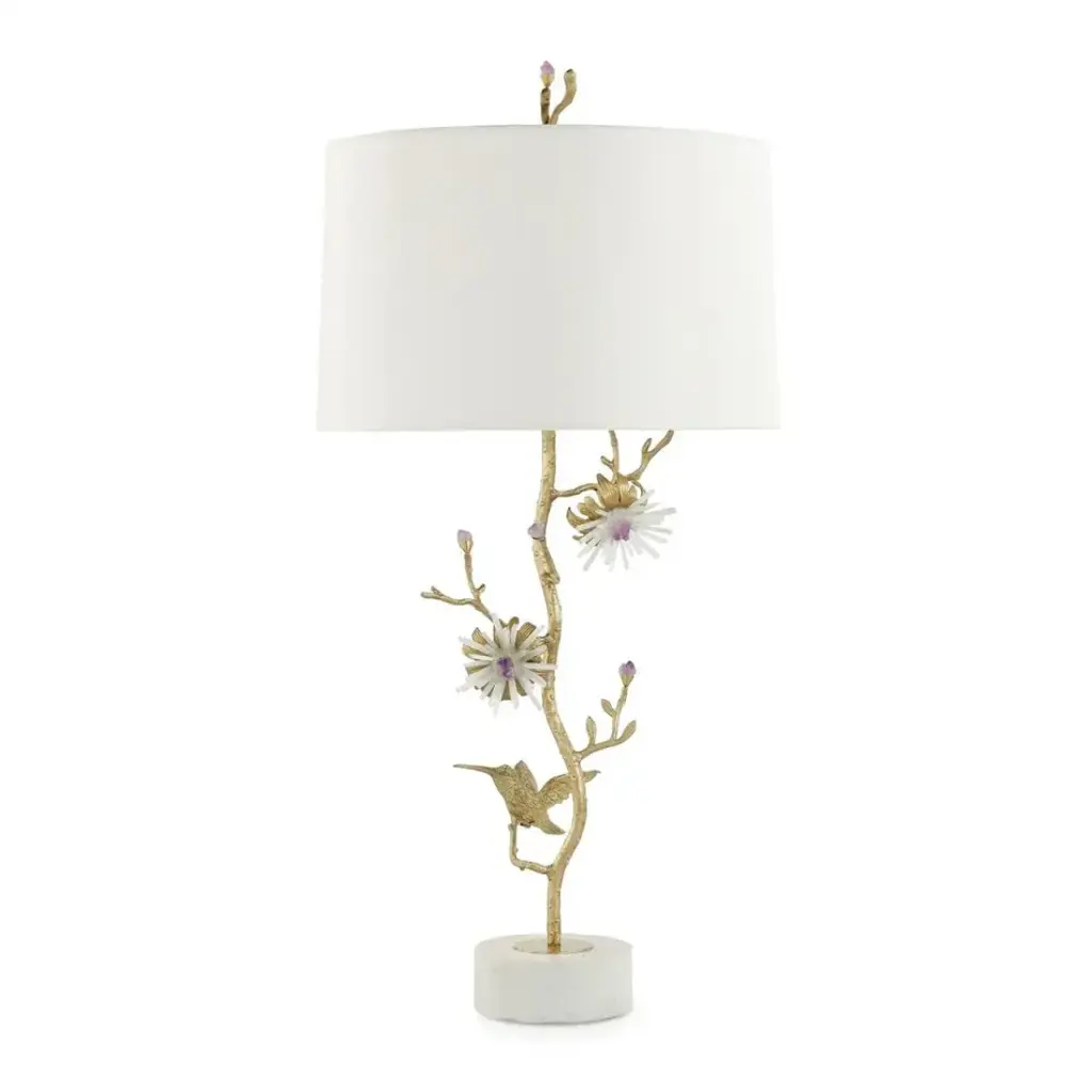 The Gemstone Garden Table Lamp represents a stunning marriage of natural motifs and chic modern design. Crafted from brass in a Honey finish, the piece takes the form of an opulent sapling dotted with crystalline flowers of selenite and amethyst. A small bird can also be perched atop the branches, recreated with intricate detail. This three-way turnkey lamp features a round marble base and an organic finial embellished with an amethyst crystal.