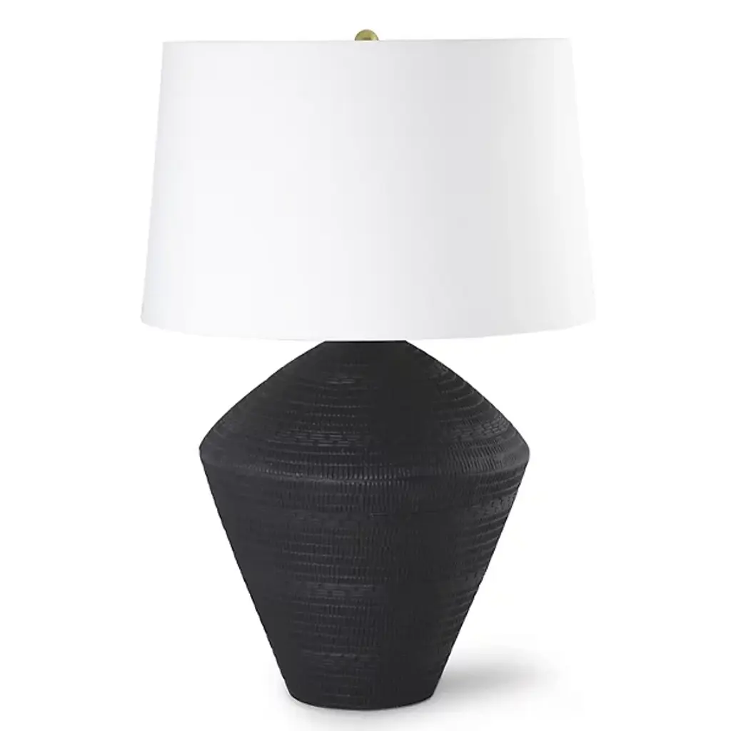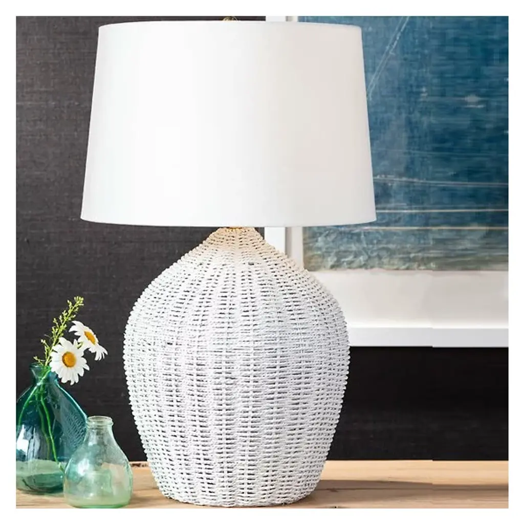 Elevate your natural home décor with the Georgian Table Lamp from Regina Andrew. A striking handcrafted base made of woven natural rattan defines the lamp’s unique aesthetic, while a smooth white linen shade tapers gently atop the piece as it filters light from its inner lamping. Its subtle curves harmonize with the textural surface of its woven body, providing an organic accent and elegant accent piece for any interior décor.