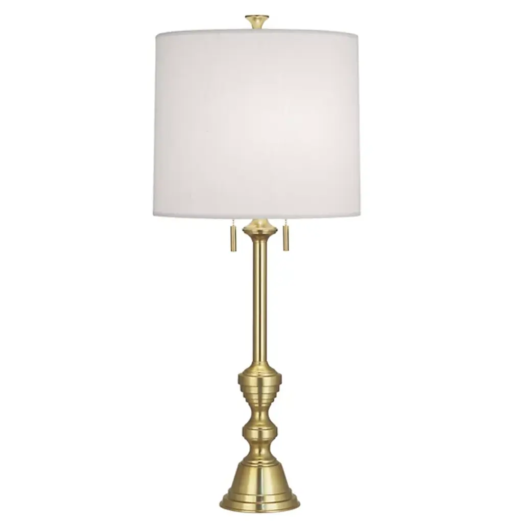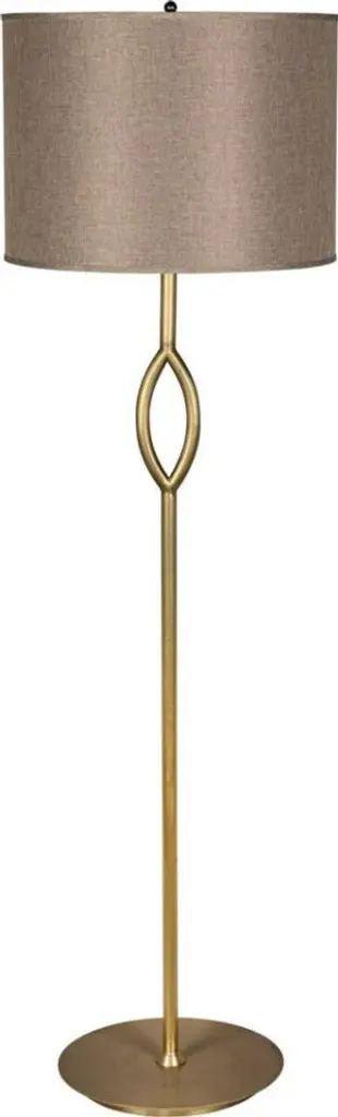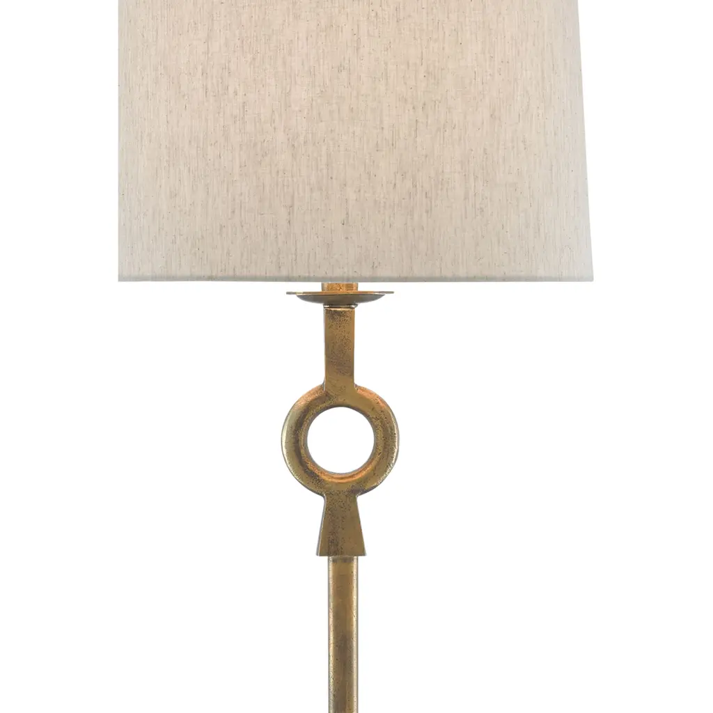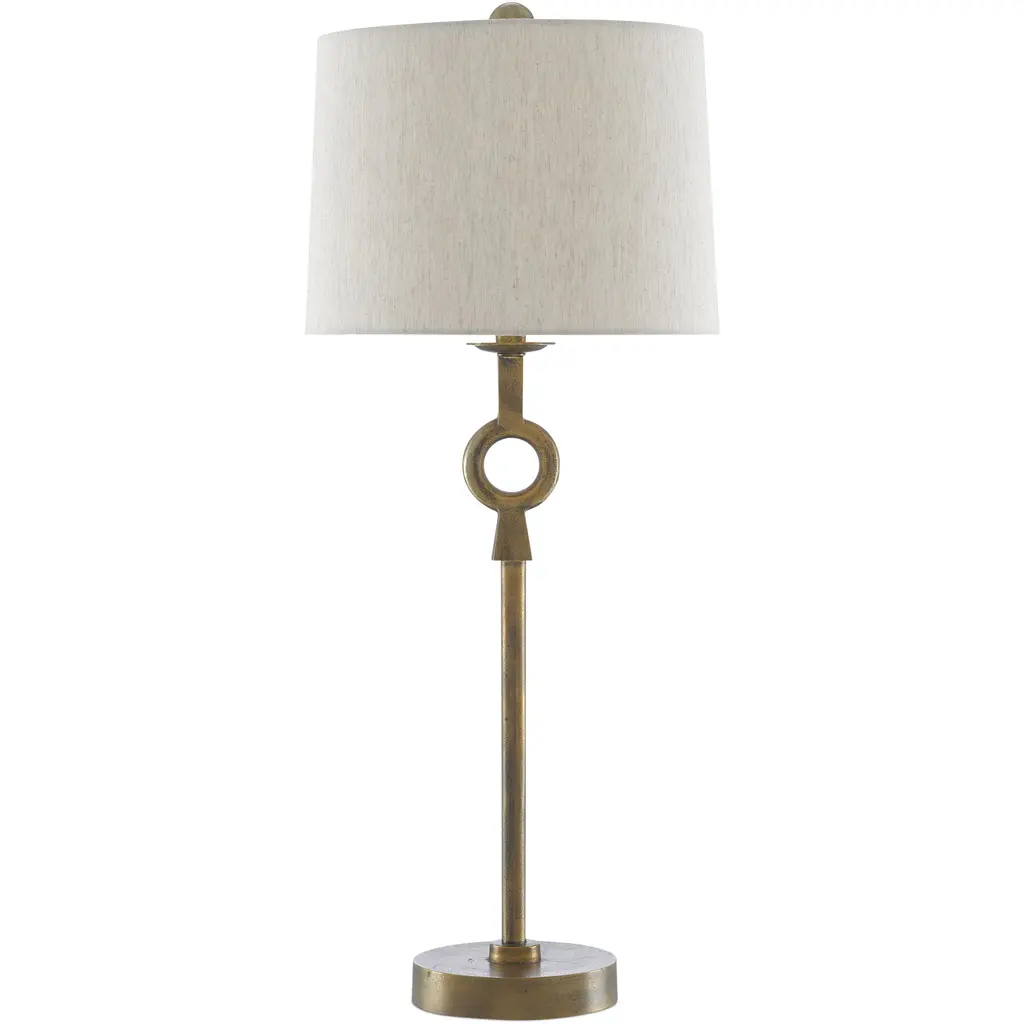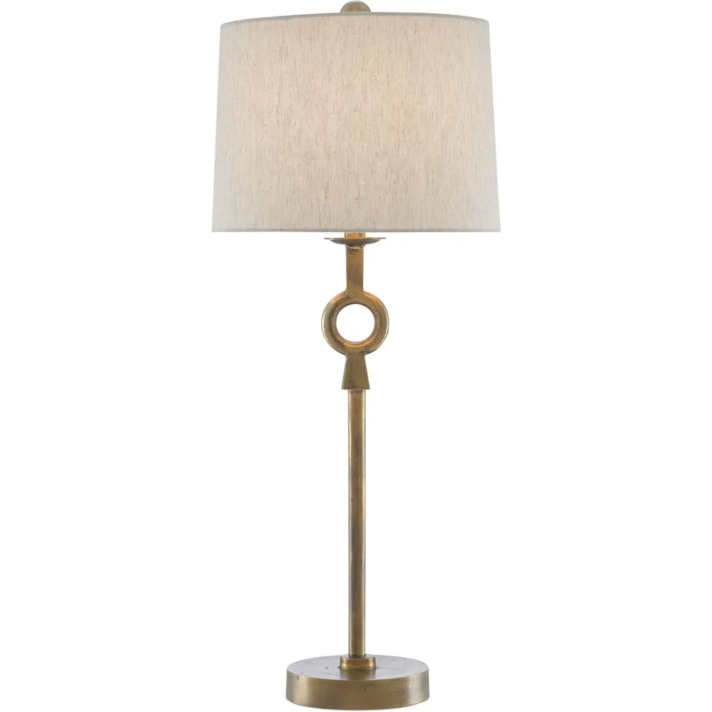 It doesn’t take much geometric enhancement for a stem-like body of a lamp to take on added personality. Our Germaine Table Lamp with its cleverly placed circlet is proof of this. Made of aluminum in an antique brass finish, the straightforward design will prove to be flexible, fitting beautifully within any number of room styles. An antique brass finial fastens the natural cotton flax shade to the brass lamp. We also offer the Germaine in a floor lamp.