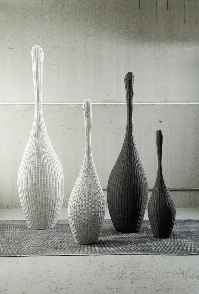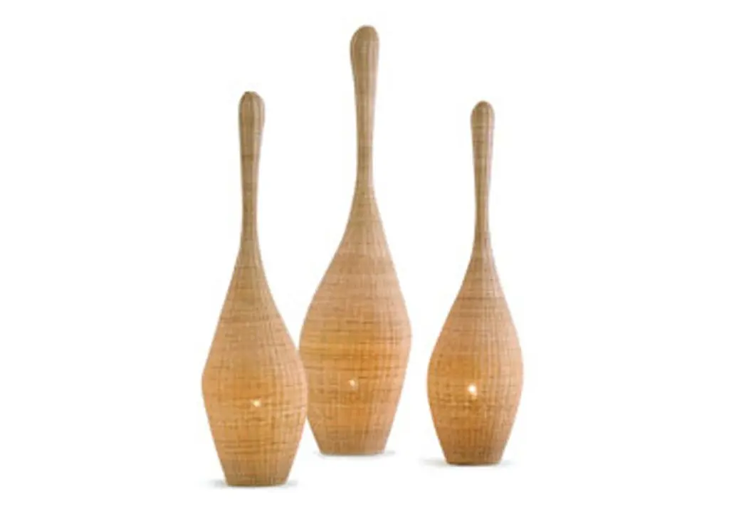 Family of lamps made entirely of natural mélange woven wicker or lacquered in matt white, grey, black, ocean or dove-grey, characterised by a shape that recalls that of a bottle and by a skilful play of workmanship, shapes and colours. The products stand out thanks to the beauty of the natural fibre weave combined with an original design, giving them character and uniqueness. Available in different sizes, from S to XL, a piece of furniture that can be used individually or in combinations for an even more suggestive, cinematographic effect.Floor standing lamp in natural melange rattan core with wiring, switch and bulb 19 W, 220 Volt, bulb holder E 27. On request, 110 Volt, US plug.Additional Information:Material: RattanFinish: Natural melange rattan corePower supply: Bulb 19 W, 220 Volt, bulb holder E 27Dimension: Ø 56 x 225 H cmAvailable in other finish options: Matt white, grey, air force blue, black lacqueredAvailable in other size options: Large, medium, small