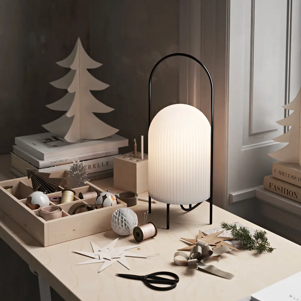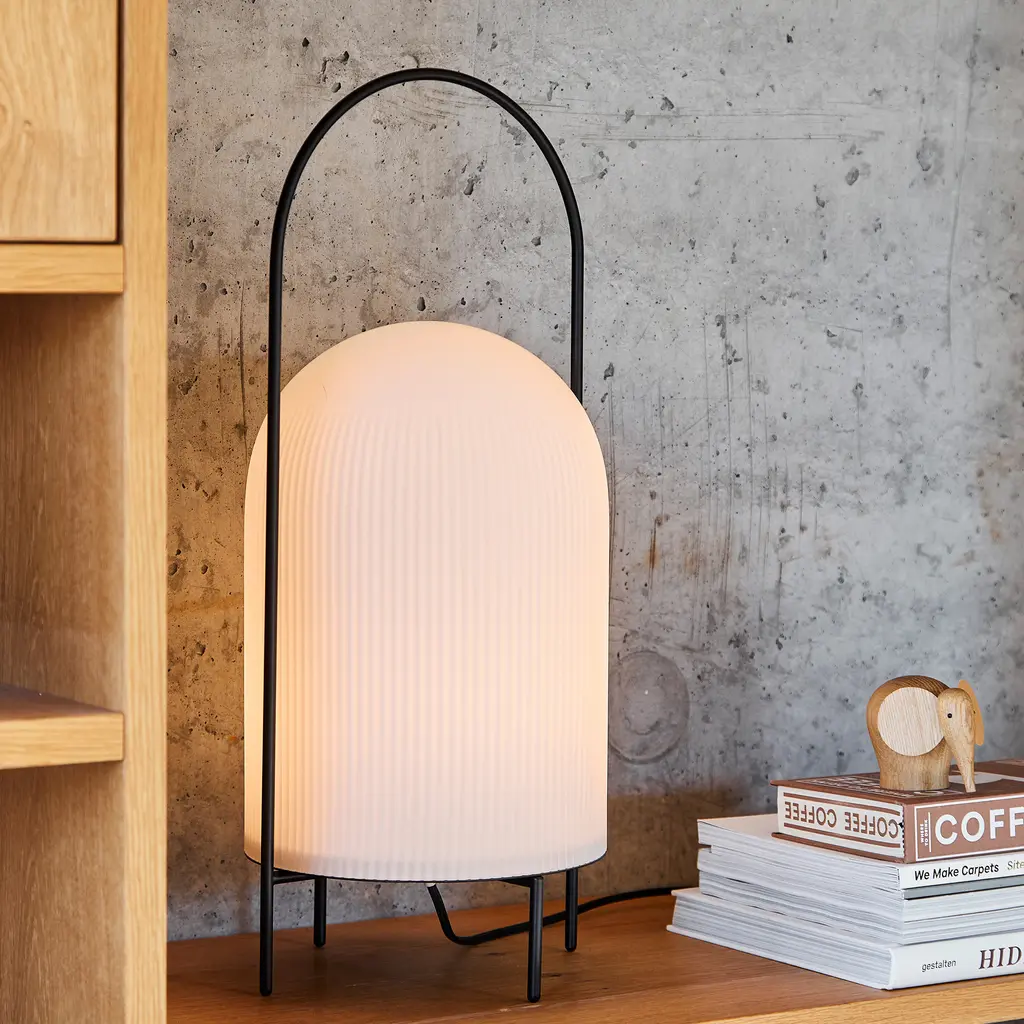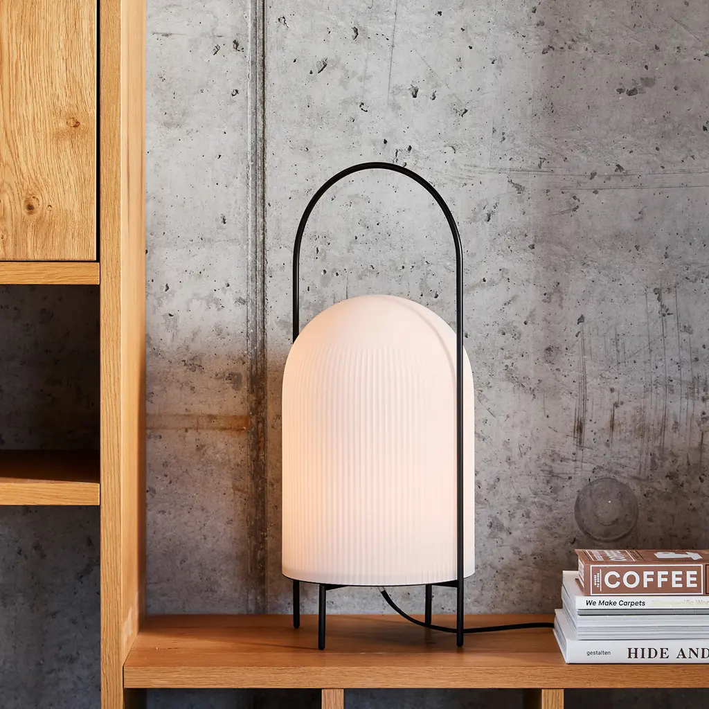 The Ghost Table Lamp is a contemporary take on classic portable oil lamps, embodying a blend of tradition and modern design. Its sleek metal rod, finished in smooth black paint, forms a protective embrace around the lampshade, while the arched bail above doubles as a practical handle, enhancing the lamp’s portability. The lamp’s standout feature is its opal glass shade, meticulously crafted to create an ethereal visual reminiscent of a white cloth delicately draped over the light. This illusion is amplified by a gentle vertical groove pattern etched into the glass, which gradually fades as it ascends, lending a touch of elegance and sculptural beauty to the lamp. The fabric-covered cord is fitted with a dimmable switch, allowing for versatile lighting options. The lamp accommodates an E14 bulb (cUL: E12), with a maximum wattage of 25W, ensuring that it provides both style and functional illumination in any setting. This lamp is an exquisite addition to any interior, striking a perfect balance between artistic design and practical utility.