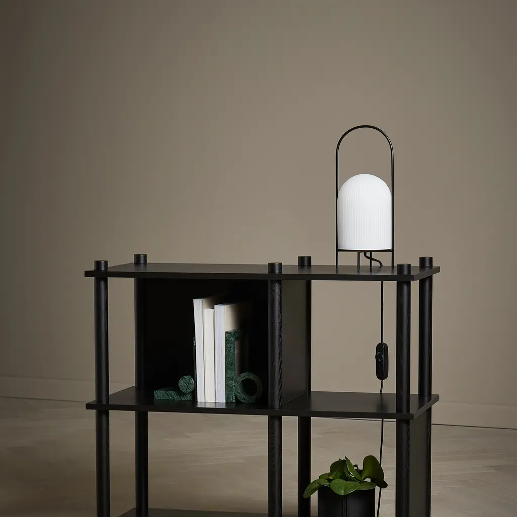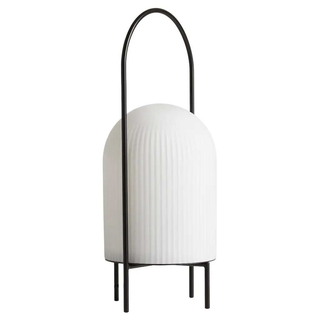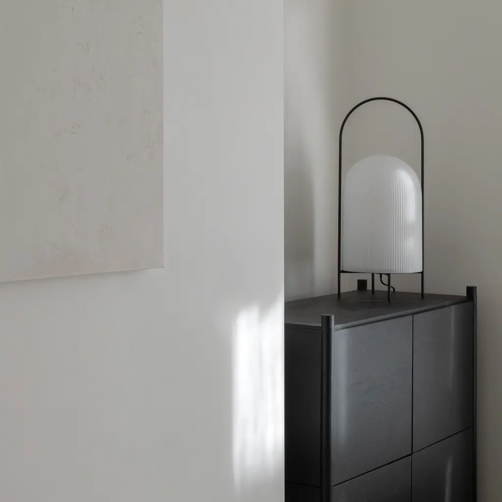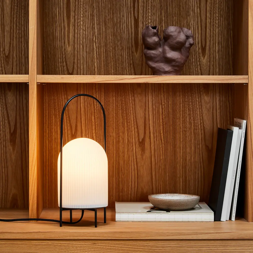 The Ghost Table Lamp is a contemporary take on classic portable oil lamps, embodying a blend of tradition and modern design. Its sleek metal rod, finished in smooth black paint, forms a protective embrace around the lampshade, while the arched bail above doubles as a practical handle, enhancing the lamp’s portability. The lamp’s standout feature is its opal glass shade, meticulously crafted to create an ethereal visual reminiscent of a white cloth delicately draped over the light. This illusion is amplified by a gentle vertical groove pattern etched into the glass, which gradually fades as it ascends, lending a touch of elegance and sculptural beauty to the lamp. The fabric-covered cord is fitted with a dimmable switch, allowing for versatile lighting options. The lamp accommodates an E14 bulb (cUL: E12), with a maximum wattage of 25W, ensuring that it provides both style and functional illumination in any setting. This lamp is an exquisite addition to any interior, striking a perfect balance between artistic design and practical utility.