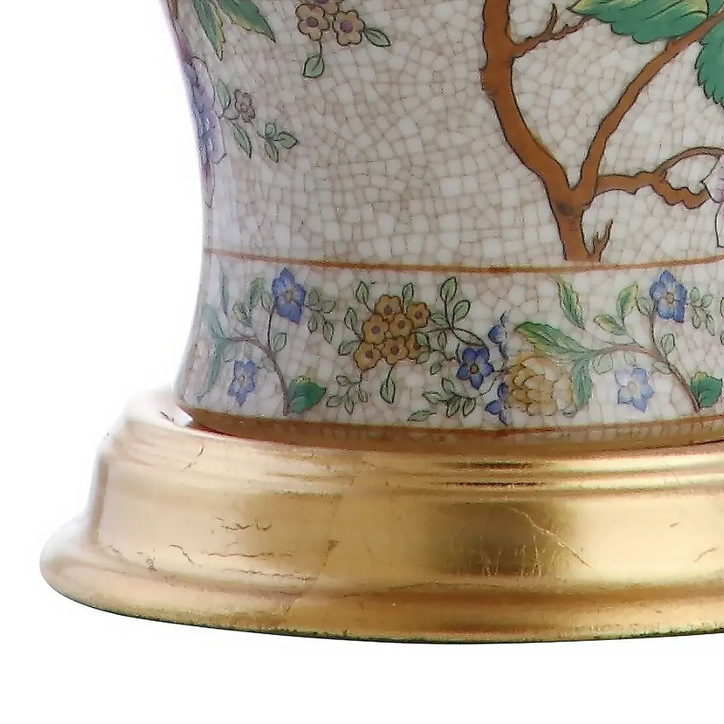 With its crackled glaze, hand-painted flowers, and graceful urn shape, this table lamp pays tribute to traditional European finesse. The gleaming brass base, the linen shade, and the silk-wrapped cord underscore its elegance.