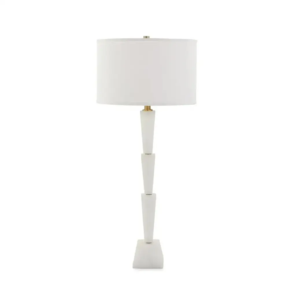 The Giada Bianca Table Lamp is a stunning display of craftsmanship, infusing an interior space with hints of elegance and sophistication. Crafted from natural white jade, a stack of three tapered cones creates a gorgeous silhouette. Steel hardware in Brushed Brass with a matching finial provides warm metallic tones to the natural stone. This three-way table lamp sits atop a tapered white jade base, completing the look.