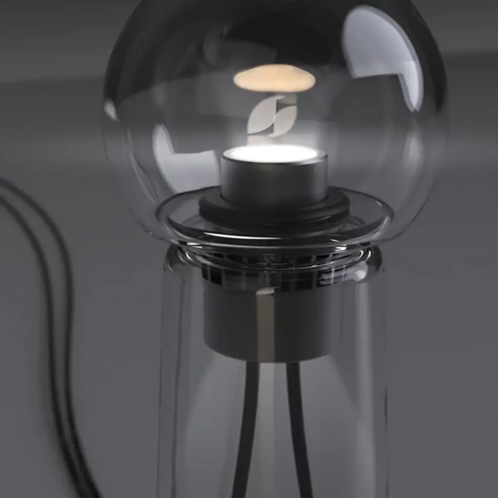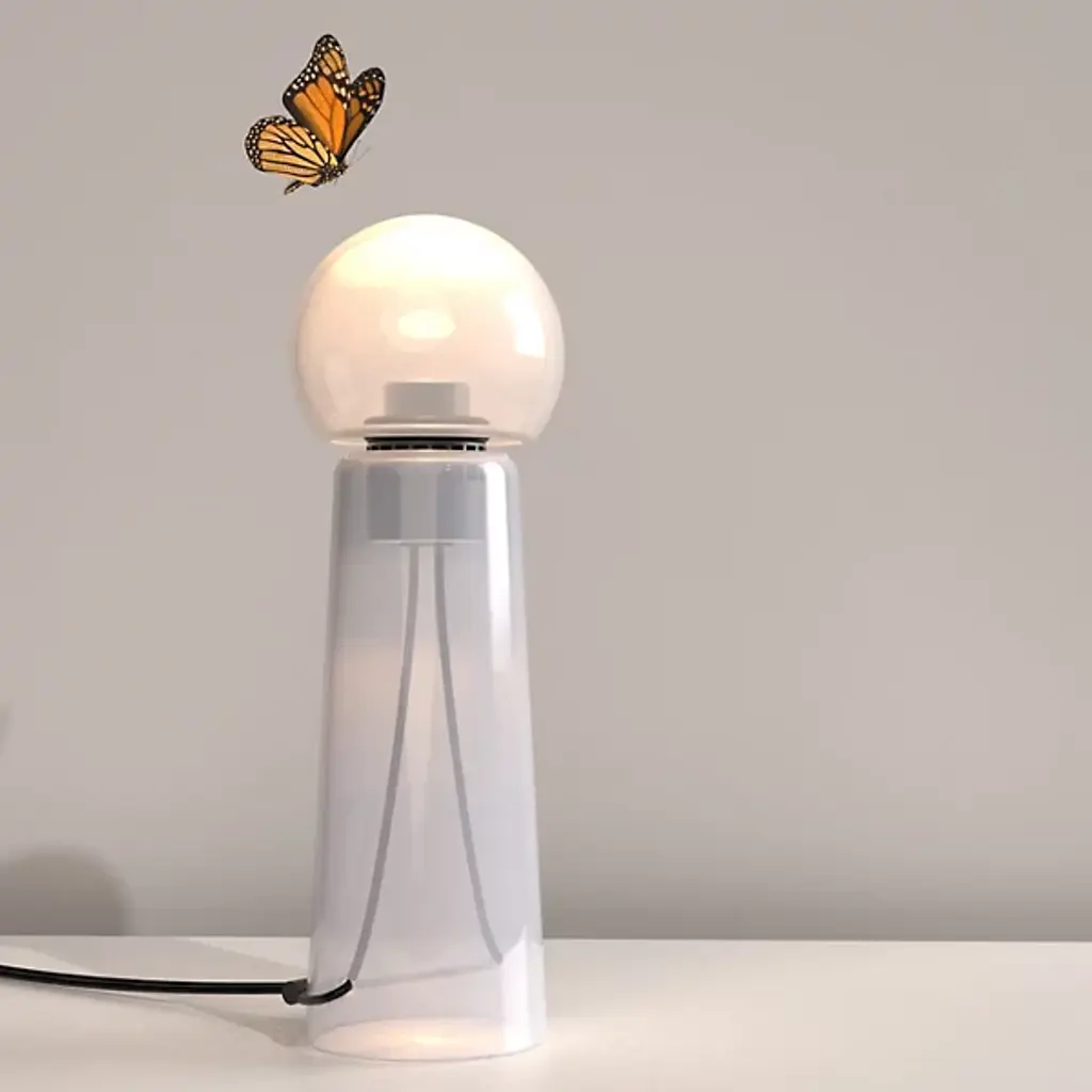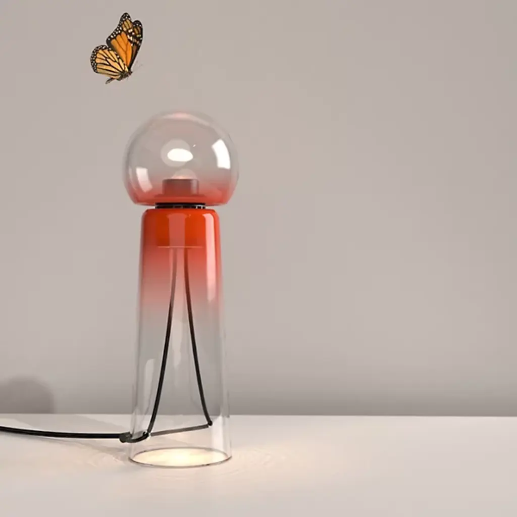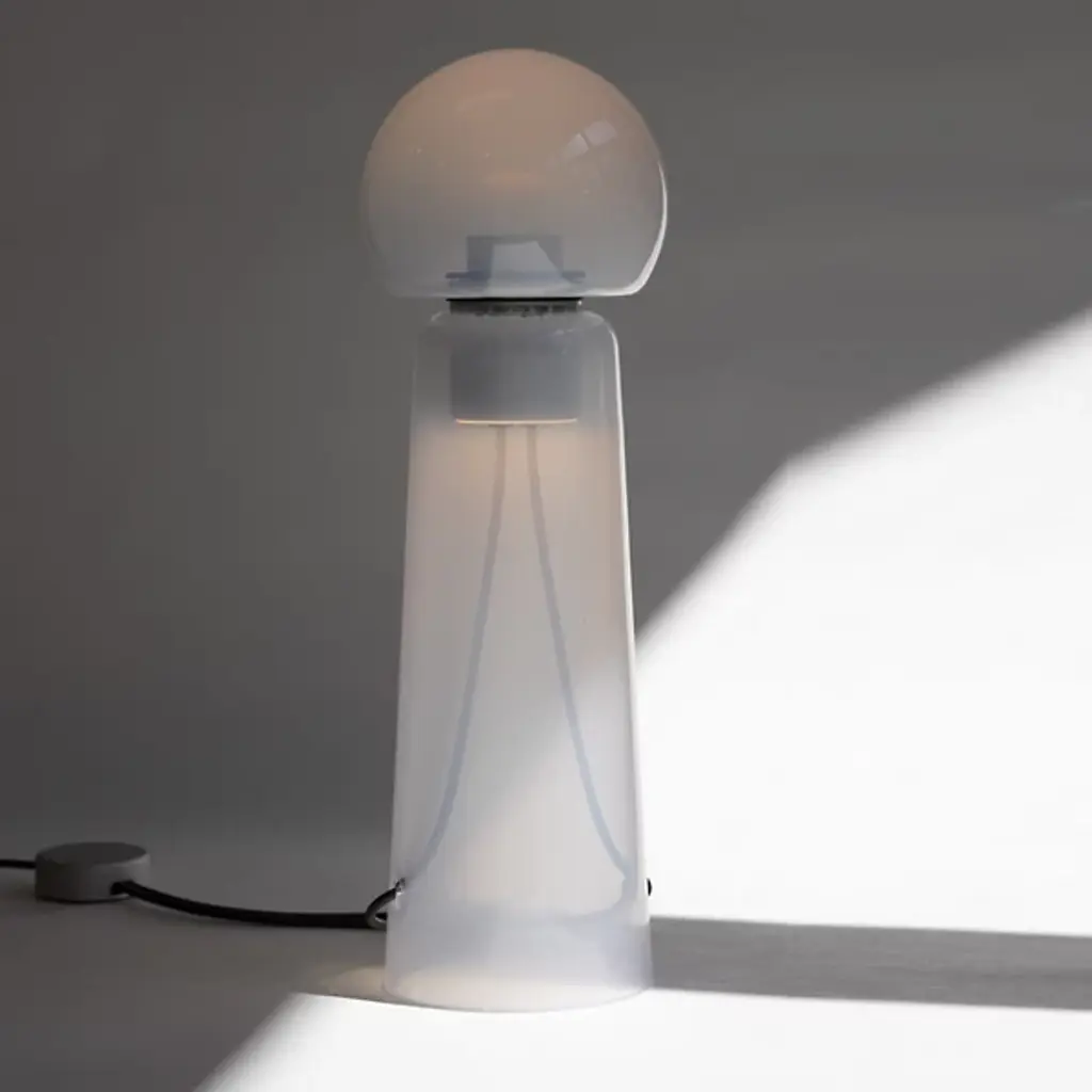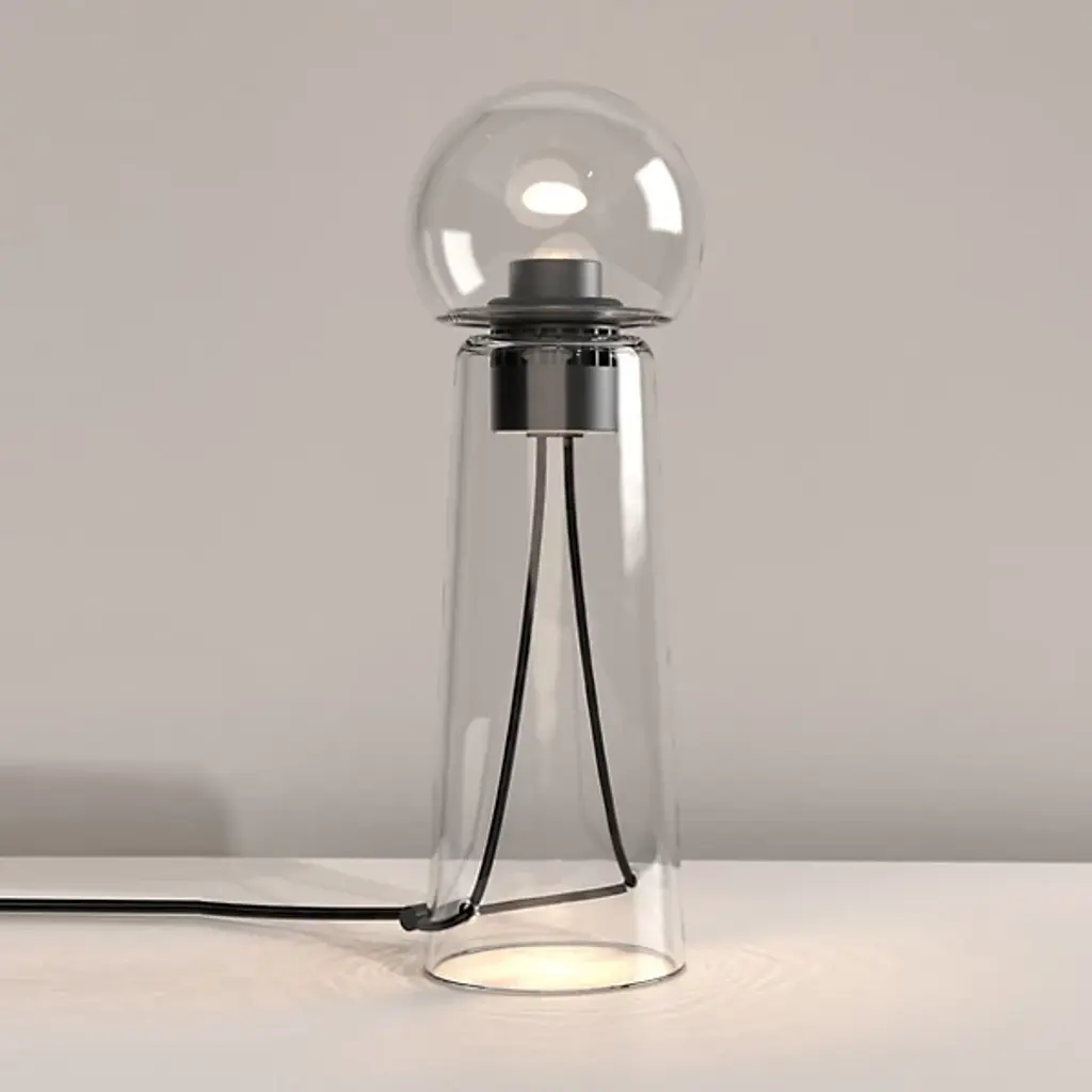Accent the smaller surfaces of your home with the stylish and stand-out presence of the Gigi LED Table Lamp from Darmes. Made of handcrafted blown glass throughout, this unique and thoughtful piece was designed by Alexandre Joncas. A thin wire leads inside a clean and transparent cylindrical body and splits into a pair that lead up to a single light source. The bowl-shaped head houses a light source that diffuses through the material with ease, creating a welcoming glow in the surrounding space.